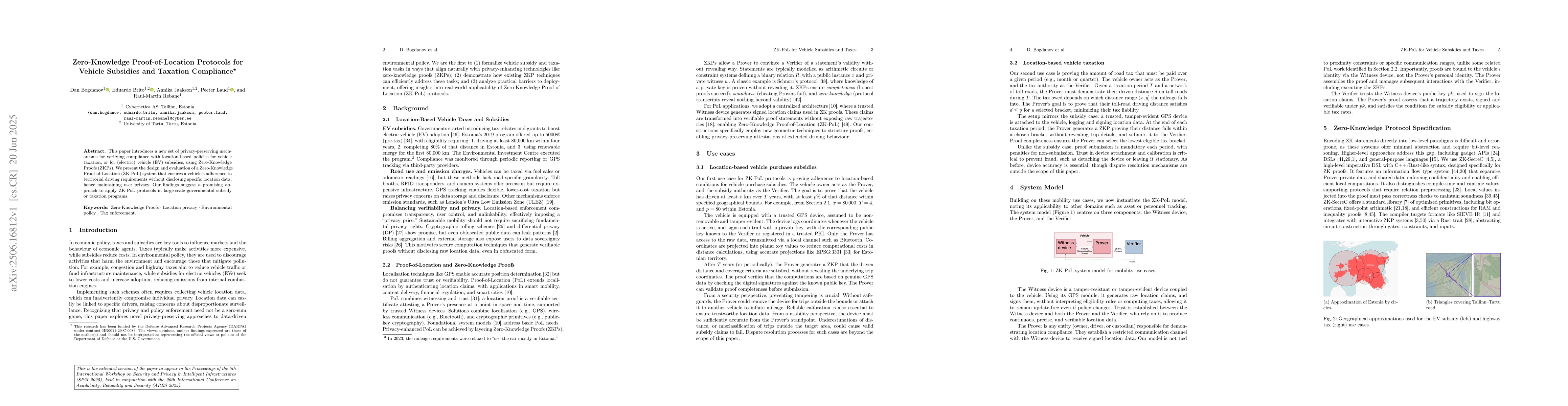 This paper introduces a new set of privacy-preserving mechanisms for verifying compliance with location-based policies for vehicle taxation, or for (electric) vehicle (EV) subsidies, using Zero-Knowledge Proofs (ZKPs). We present the design and evaluation of a Zero-Knowledge Proof-of-Location (ZK-PoL) system that ensures a vehicle's adherence to territorial driving requirements without disclosing specific location data, hence maintaining user privacy. Our findings suggest a promising approach to apply ZK-PoL protocols in large-scale governmental subsidy or taxation programs.