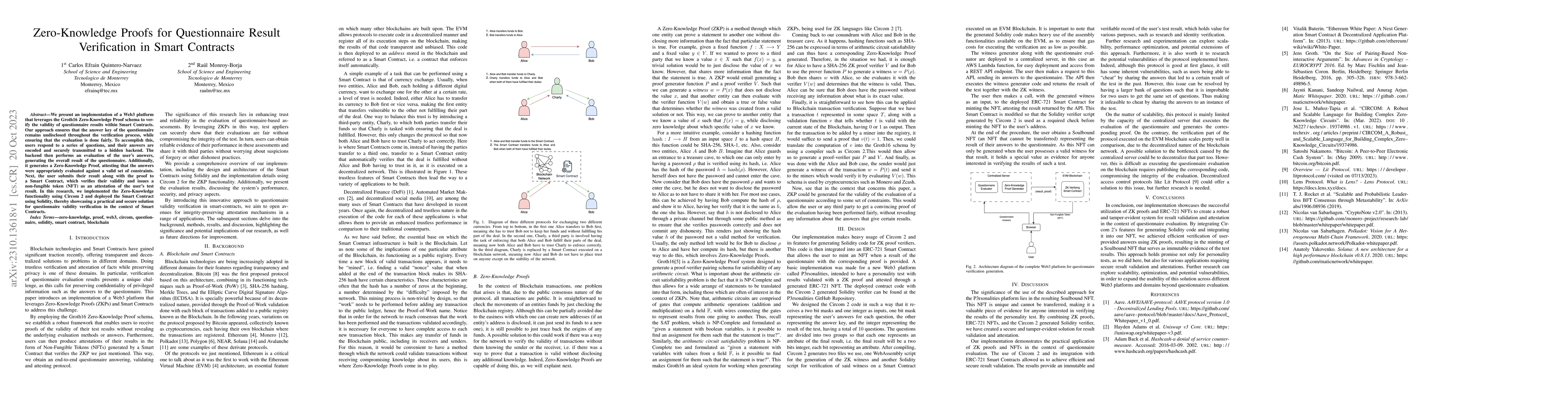 This paper implements a Web3 platform using Groth16 Zero-Knowledge Proofs to verify questionnaire results in Smart Contracts, ensuring answer confidentiality and fair evaluation. The system generates a Zero-Knowledge Proof for answer validation, and verified results are rewarded with an NFT, demonstrated using Circom 2 and Solidity.