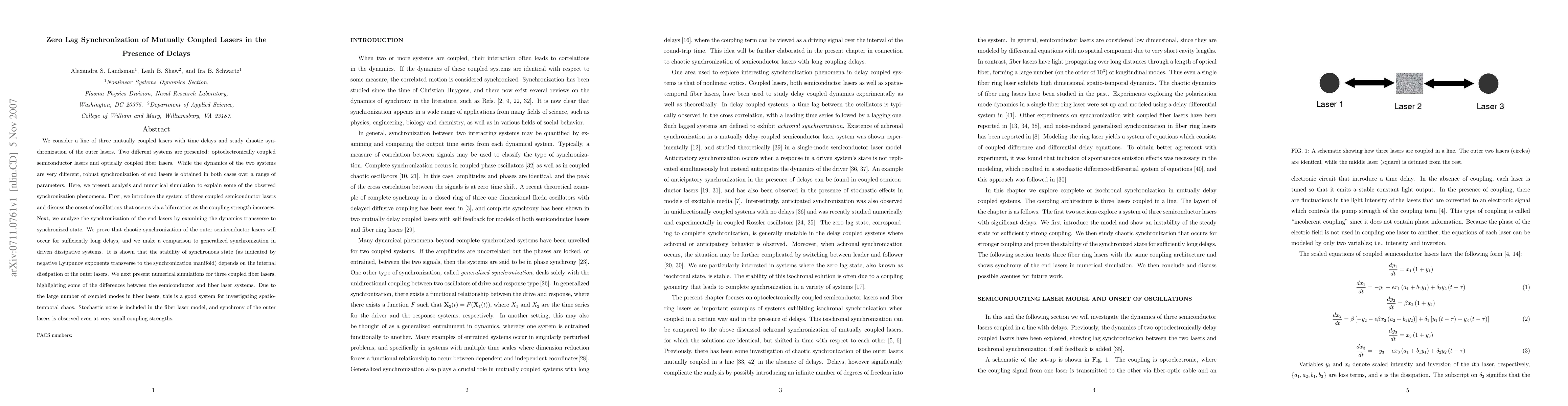 We consider a line of three mutually coupled lasers with time delays and study chaotic synchronization of the outer lasers. Two different systems are presented: optoelectronically coupled semiconductor lasers and optically coupled fiber lasers. While the dynamics of the two systems are very different, robust synchronization of end lasers is obtained in both cases over a range of parameters. Here, we present analysis and numerical simulation to explain some of the observed synchronization phenomena. First, we introduce the system of three coupled semiconductor lasers and discuss the onset of oscillations that occurs via a bifurcation as the coupling strength increases. Next, we analyze the synchronization of the end lasers by examining the dynamics transverse to synchronized state. We prove that chaotic synchronization of the outer semiconductor lasers will occur for sufficiently long delays, and we make a comparison to generalized synchronization in driven dissipative systems. It is shown that the stability of synchronous state (as indicated by negative Lyupunov exponents transverse to the synchronization manifold) depends on the internal dissipation of the outer lasers. We next present numerical simulations for three coupled fiber lasers, highlighting some of the differences between the semiconductor and fiber laser systems. Due to the large number of coupled modes in fiber lasers, this is a good system for investigating spatio-temporal chaos. Stochastic noise is included in the fiber laser model, and synchrony of the outer lasers is observed even at very small coupling strengths.