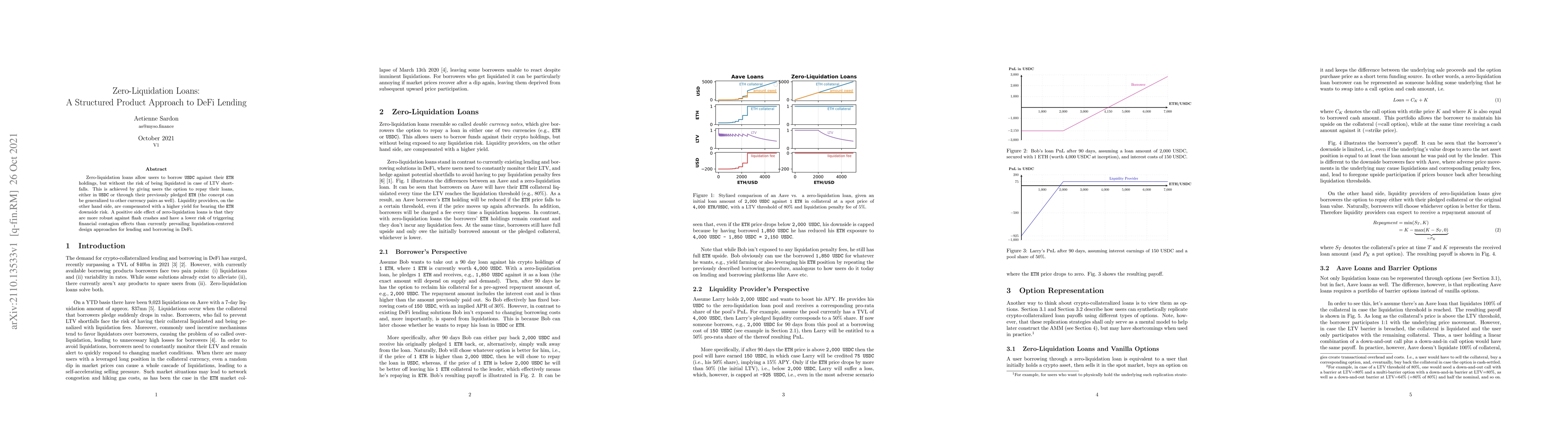 Zero-Liquidation loans allow DeFi users to borrow USDC against their ETH holdings, but without the risk of being liquidated in case of LTV shortfalls. This is achieved by giving users the option to repay their loans, either in USDC or through their previously pledged ETH (the concept can be generalized to other currency pairs as well). Liquidity providers, on the other hand side, are compensated with a higher yield for bearing the ETH downside risk. A positive side effect of zero-liquidation loans is that they are more robust against flash crashes and have a lower financial contagion effect than current lending and borrowing protocols.