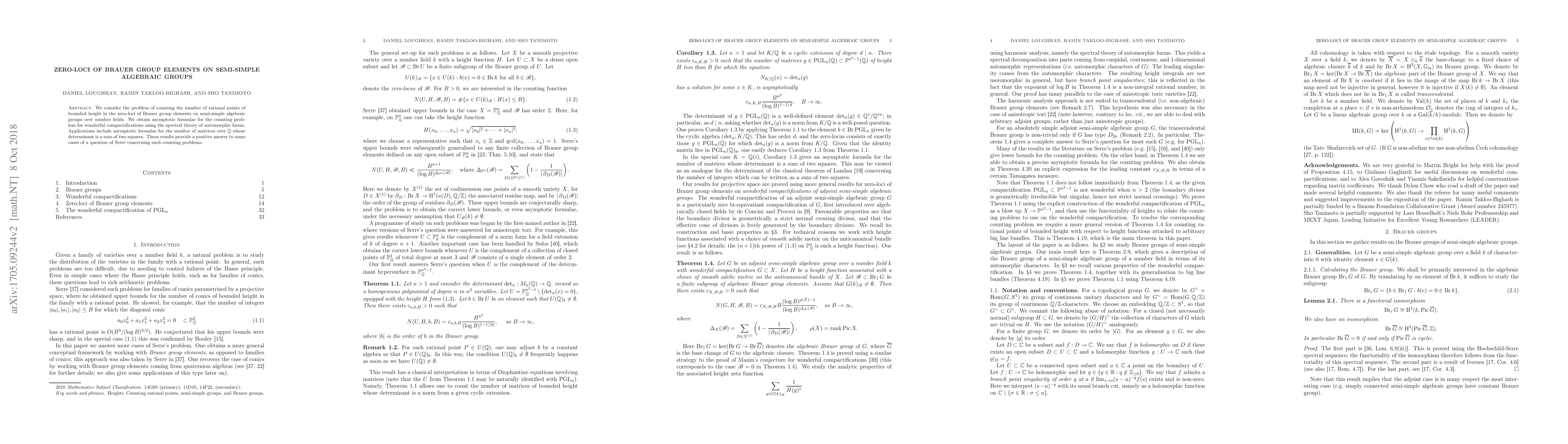 This paper counts rational points of bounded height in zero-loci of Brauer group elements on semi-simple algebraic groups over number fields, deriving asymptotic formulae via spectral theory of automorphic forms. It also applies these results to count matrices over Q with determinants as sums of two squares, providing a solution to some cases of Serre's question.