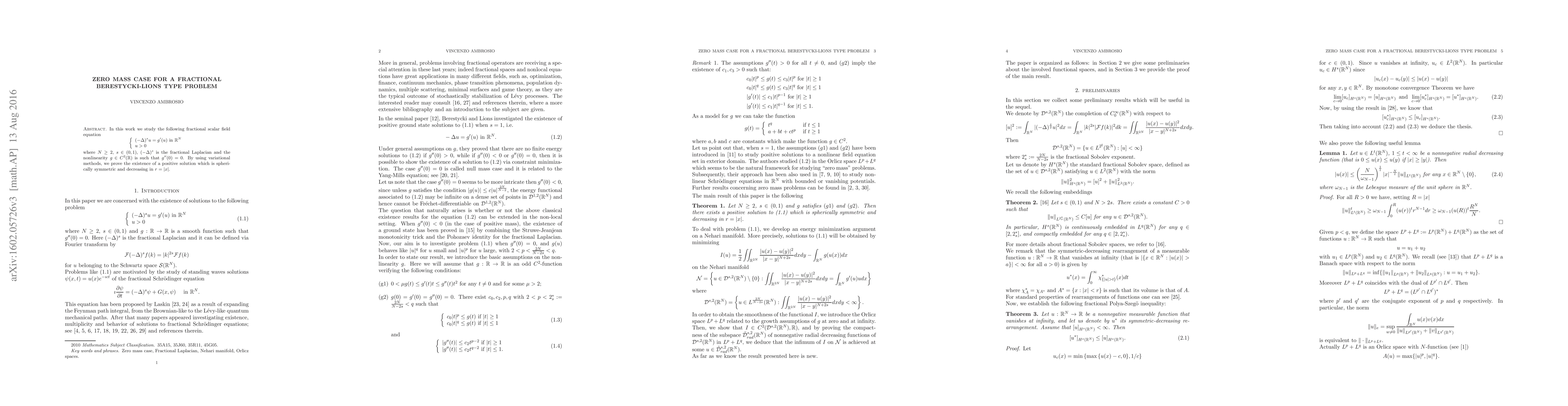 In this work we study the following fractional scalar field equation \begin{equation*}\label{P} \left\{ \begin{array}{ll} (-\Delta)^{s} u = g'(u) \mbox{ in } \mathbb{R}^{N} \\ u> 0 \end{array} \right. \end{equation*} where $N\geq 2$, $s\in (0,1)$, $(-\Delta)^{s}$ is the fractional Laplacian and the nonlinearity $g\in C^{2}(\mathbb{R})$ is such that $g''(0)=0$. By using variational methods, we prove the existence of a positive solution which is spherically symmetric and decreasing in $r=|x|$.