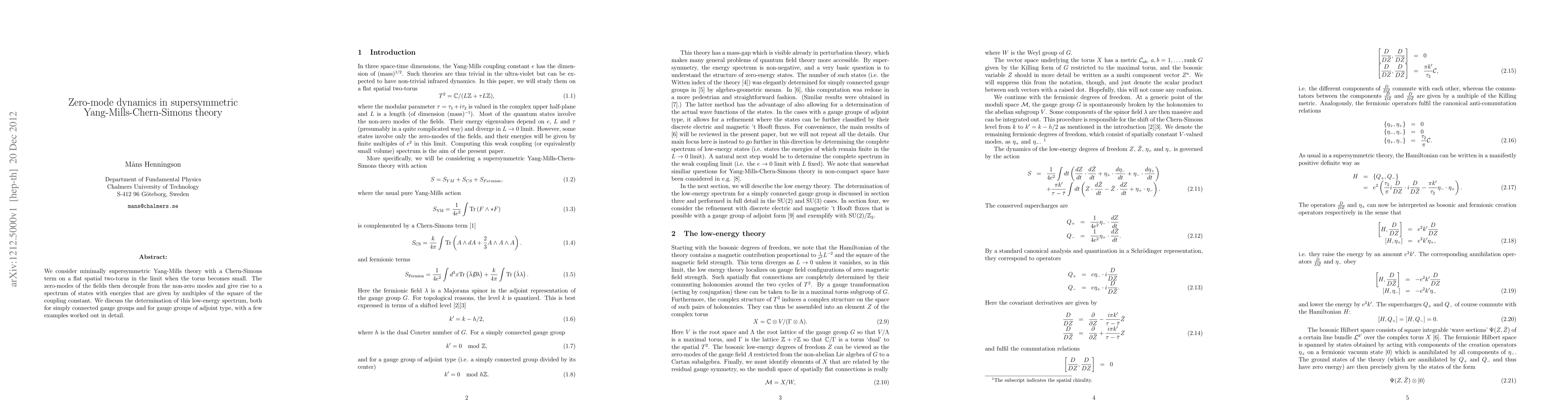 This paper investigates the zero-mode dynamics in supersymmetric Yang-Mills-Chern-Simons theory on a shrinking two-torus, showing how zero-modes decouple and produce a low-energy spectrum proportional to the square of the coupling constant. Detailed examples explore this phenomenon for both simply connected and adjoint gauge groups.
