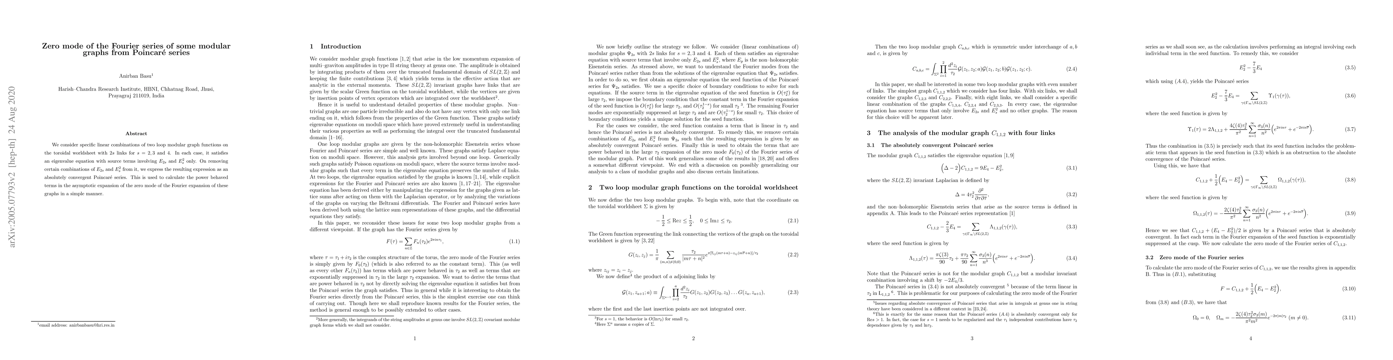 We consider specific linear combinations of two loop modular graph functions on the toroidal worldsheet with $2s$ links for $s=2, 3$ and $4$. In each case, it satisfies an eigenvalue equation with source terms involving $E_{2s}$ and $E_s^2$ only. On removing certain combinations of $E_{2s}$ and $E_s^2$ from it, we express the resulting expression as an absolutely convergent Poincare series. This is used to calculate the power behaved terms in the asymptotic expansion of the zero mode of the Fourier expansion of these graphs in a simple manner.
