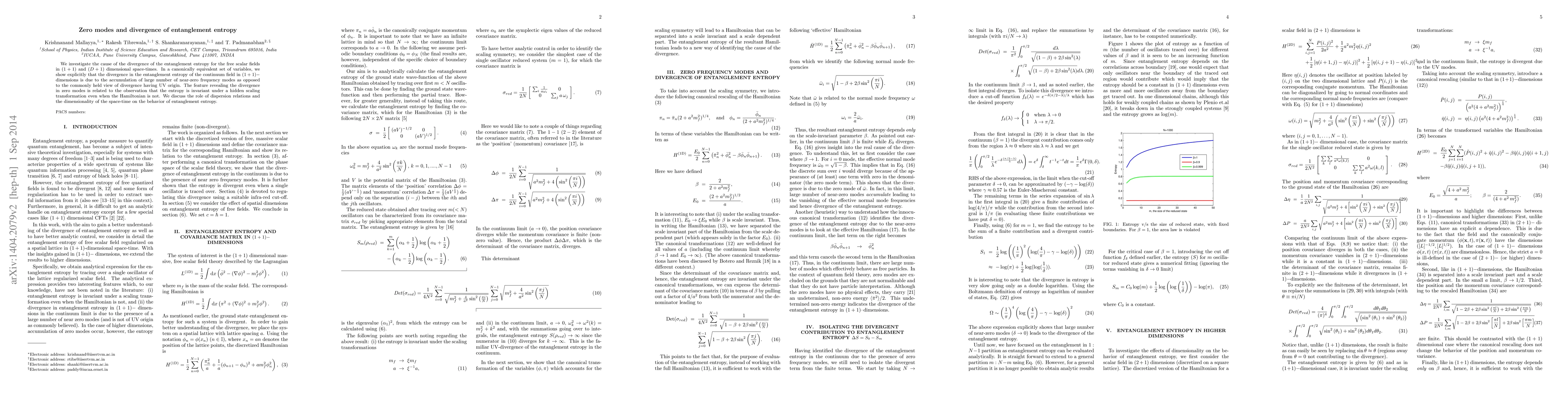 This paper explores the entanglement entropy divergence for free scalar fields in $(1+1)$ and $(D+1)$ dimensions, demonstrating that the divergence in $(1+1)$ dimensions arises from a large number of near-zero frequency modes rather than ultraviolet (UV) origins. It highlights the invariance of entropy under a hidden scaling transformation and examines the impact of dispersion relations and space-time dimensionality.