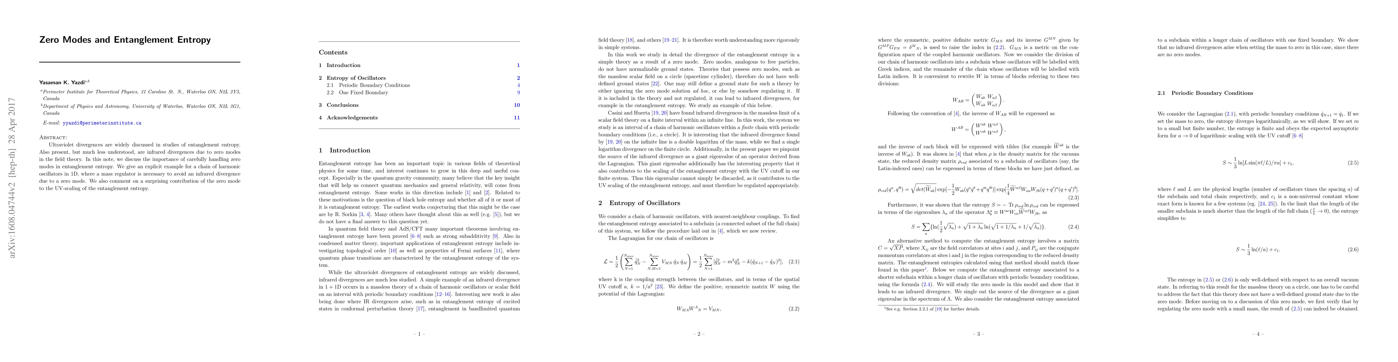 This paper discusses the importance of addressing infrared divergences caused by zero modes in entanglement entropy calculations, using a 1D chain of harmonic oscillators as an example where mass regulation is necessary. It also reveals an unexpected influence of zero modes on the ultraviolet scaling of entanglement entropy.
