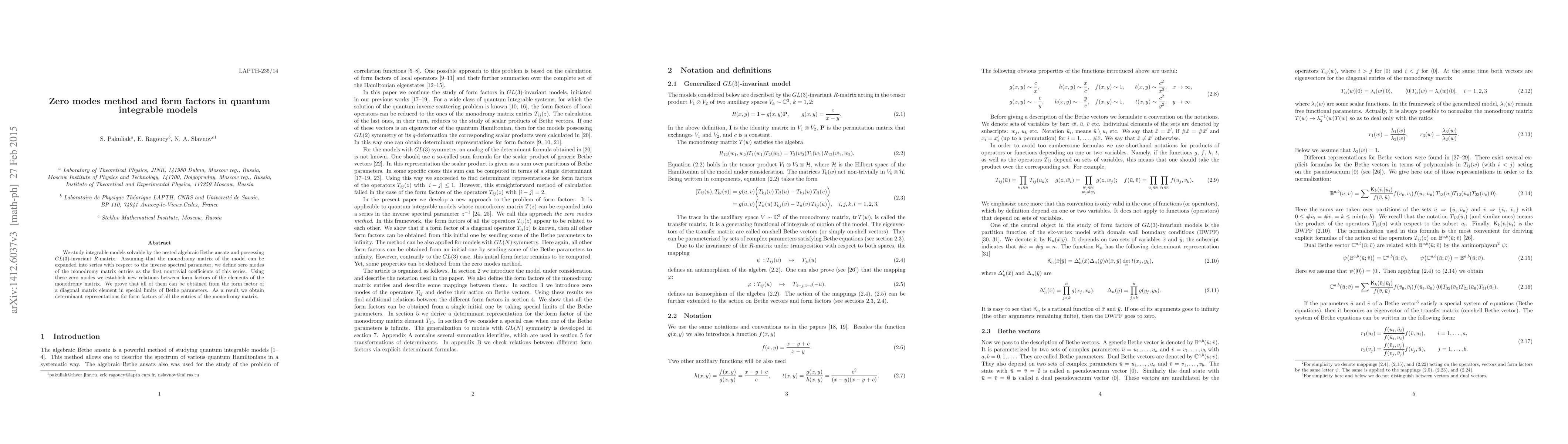 This paper explores integrable models using the nested algebraic Bethe ansatz and $GL(3)$-invariant $R$-matrix, defining zero modes from the monodromy matrix's inverse spectral parameter expansion. It establishes new relations between form factors via these zero modes and provides determinant representations for all form factors.