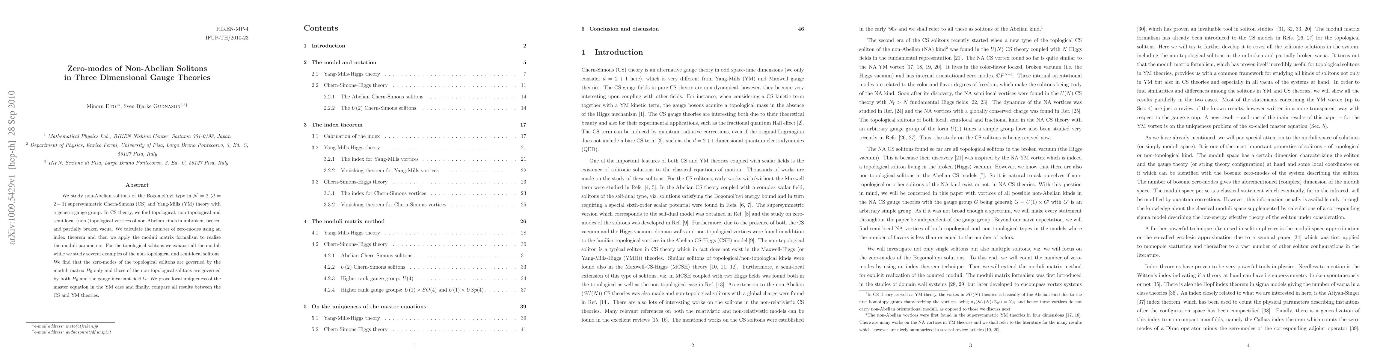 This paper investigates non-Abelian solitons in N=2 supersymmetric Chern-Simons and Yang-Mills theories, identifying various types of vortices and calculating their zero-modes using an index theorem. It finds that topological solitons' zero-modes are governed by the moduli matrix H_0, while non-topological solitons' zero-modes are influenced by both H_0 and the gauge invariant field \Omega.