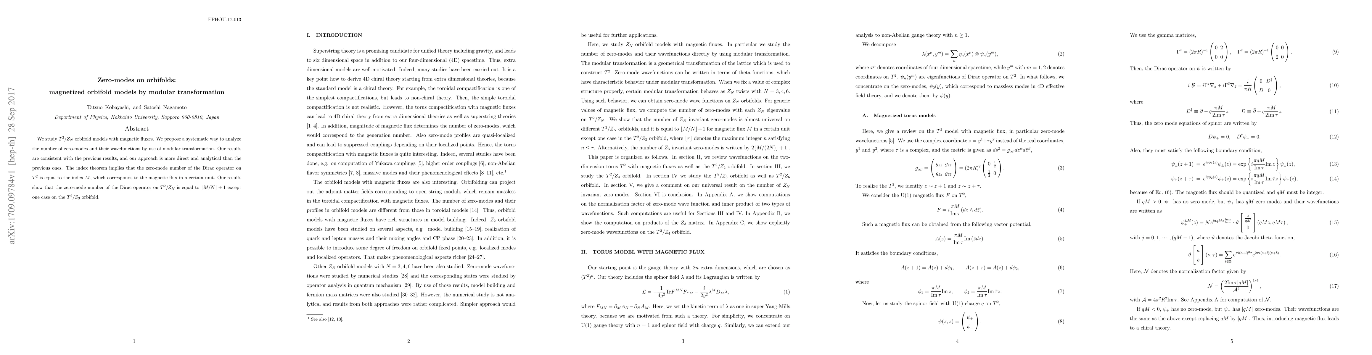 We study $T^2/Z_N$ orbifold models with magnetic fluxes. We propose a systematic way to analyze the number of zero-modes and their wavefunctions by use of modular transformation. Our results are consistent with the previous results, and our approach is more direct and analytical than the previous ones. The index theorem implies that the zero-mode number of the Dirac operator on $T^2$ is equal to the index $M$, which corresponds to the magnetic flux in a certain unit. Our results show that the zero-mode number of the Dirac operator on $T^2/Z_N$ is equal to $\lfloor M/N \rfloor +1$ except one case on the $T^2/Z_3$ orbifold.