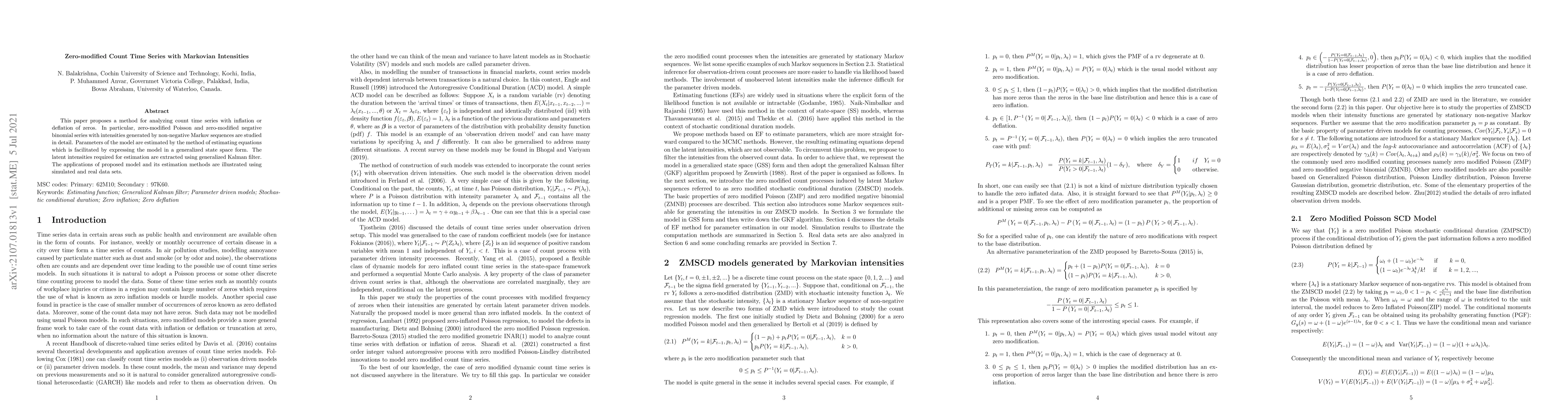 This paper proposes a method for analyzing count time series with inflation or deflation of zeros. In particular, zero-modified Poisson and zero-modified negative binomial series with intensities generated by non-negative Markov sequences are studied in detail. Parameters of the model are estimated by the method of estimating equations which is facilitated by expressing the model in a generalized state space form. The latent intensities required for estimation are extracted using generalized Kalman filter. The applications of proposed model and its estimation methods are illustrated using simulated and real data sets.