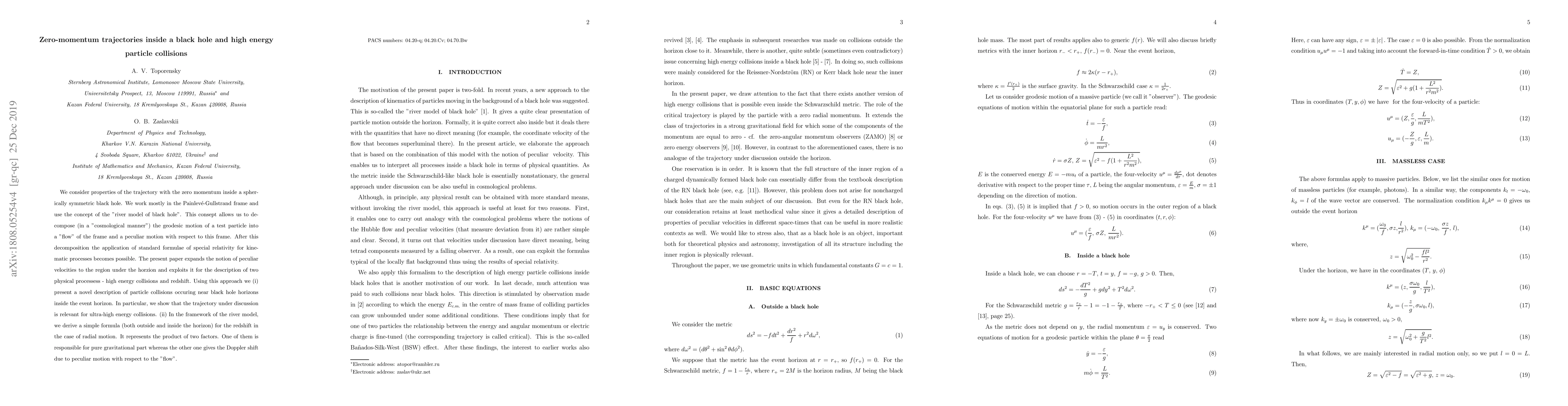 This paper explores zero-momentum trajectories within a black hole using the "river model of black hole" to decompose geodesic motion, enabling special relativity applications. It describes high-energy particle collisions near black hole horizons and derives a formula for redshift in radial motion, factoring in gravitational and Doppler effects.