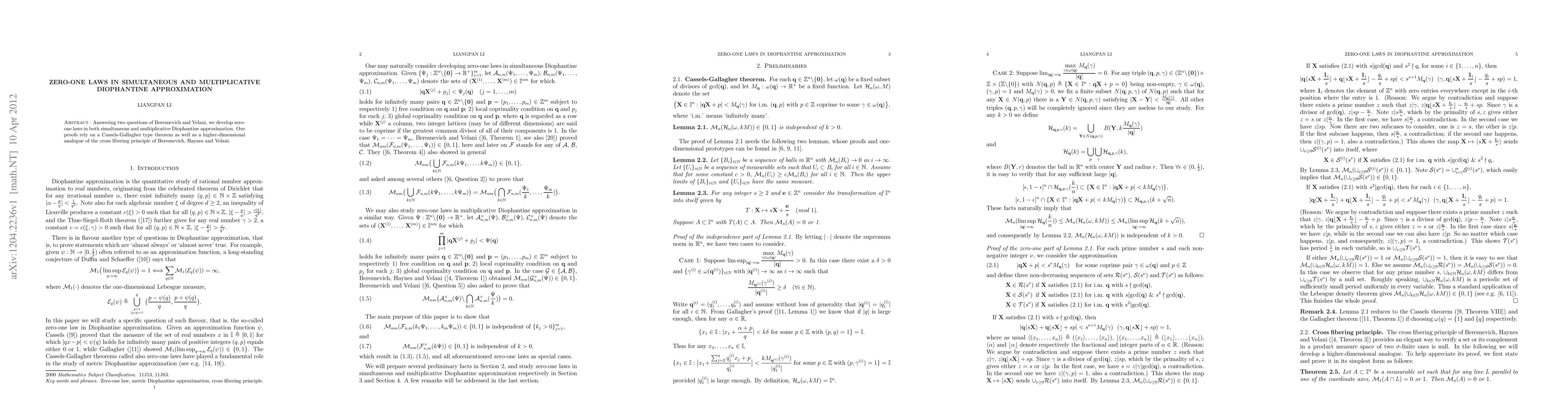 The research develops zero-one laws in both simultaneous and multiplicative Diophantine approximation using a Cassels-Gallagher type theorem and a higher-dimensional analogue of the cross-fibering principle by Beresnevich, Haynes, and Velani.