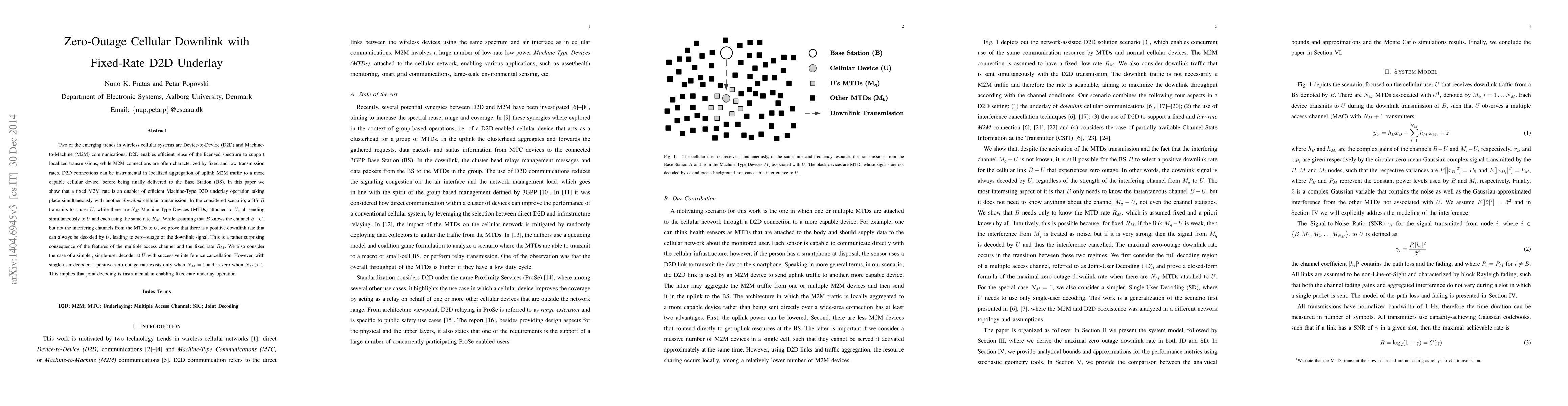 The work is novel in demonstrating that fixed-rate D2D underlay can coexist with cellular downlink transmissions without requiring CSIT from MTD-U links, and in proving the existence of a positive zero-outage rate under specific decoding schemes.