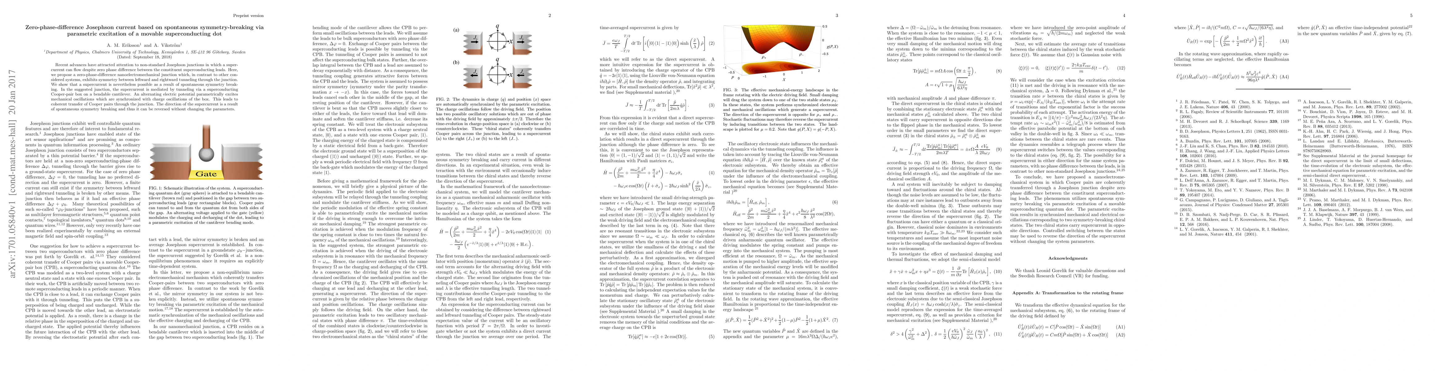 This paper proposes a novel zero-phase-difference Josephson junction utilizing a nanoelectromechanical system where a supercurrent flows due to spontaneous symmetry breaking. The junction employs a movable superconducting dot excited parametrically, enabling coherent transfer of Cooper pairs and reversible supercurrent direction.