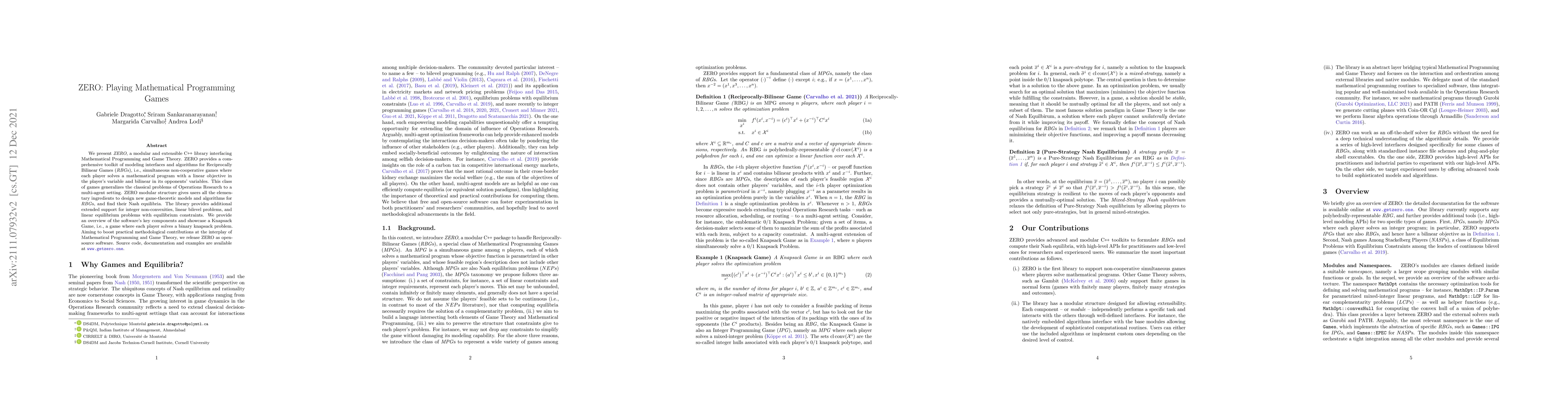 ZERO is a modular C++ library for modeling and solving Reciprocally Bilinear Games, providing tools for designing new game-theoretic models and finding Nash equilibria, with support for non-convexities and bilevel problems. It is released as open-source software to advance methodological research at the intersection of Mathematical Programming and Game Theory.