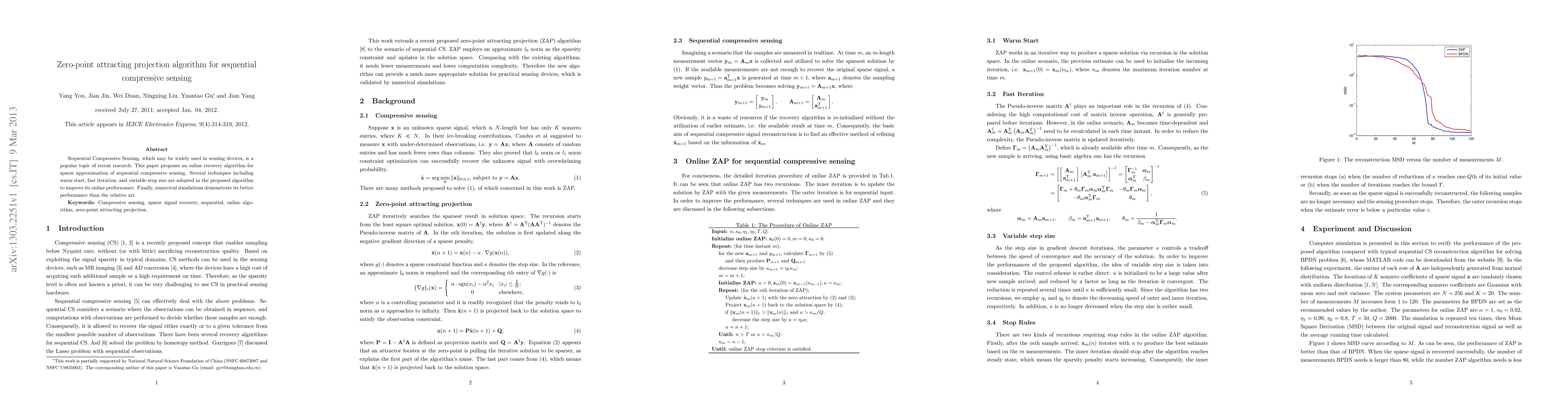 This work extends a recent zero-point attracting projection algorithm to sequential compressive sensing, introducing warm start, fast iteration, and variable step size techniques for enhanced online performance, which sets it apart from existing algorithms.