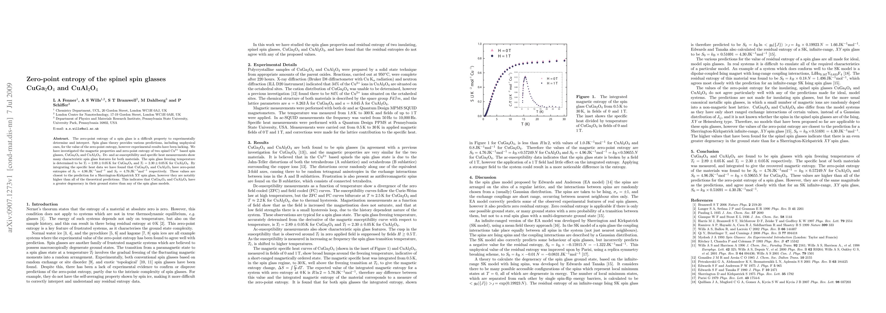 The zero-point entropy of a spin glass is a difficult property to experimentally determine and interpret. Spin glass theory provides various predictions, including unphysical ones, for the value of the zero-point entropy, however experimental results have been lacking. We have investigated the magnetic properties and zero-point entropy of two spinel Cu2+ based spin glasses, CuGa2O4 and CuAl2O4. Dc- and ac-susceptibility and specific heat measurements show many characteristic spin glass features for both materials. The spin glass freezing temperature is determined to be Tf = 2.89 +/- 0.05 K for CuGa2O4 and Tf = 2.30 +/- 0.05 K for CuAl2O4. By integrating the specific heat data we have found that CuGa2O4 and CuAl2O4 have zero-point entropies of S0 = 4.96 JK-1mol-1 and S0 = 4.76 JK-1mol-1 respectively. These values are closest to the prediction for a Sherrington-Kirkpatrick XY spin glass, however they are notably higher than all of the theoretical predictions. This indicates that CuGa2O4 and CuAl2O4 have a greater degeneracy in their ground states than any of the spin glass models.