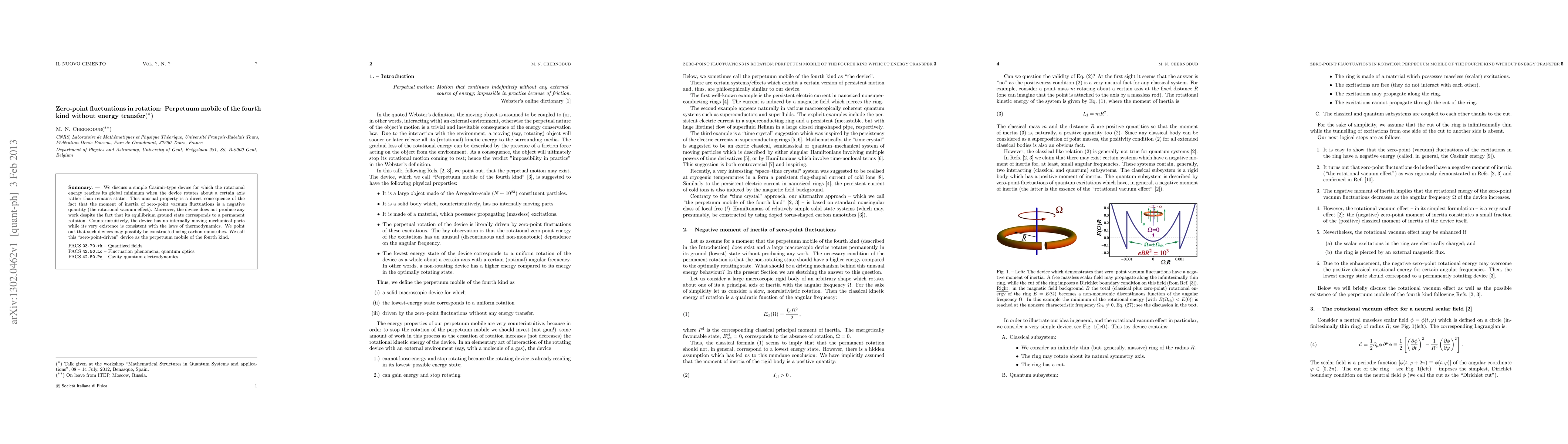 This paper explores a zero-point vacuum fluctuation-driven device that rotates at its lowest energy state, termed the "perpetuum mobile of the fourth kind," which paradoxically achieves perpetual motion without energy transfer or work production, consistent with thermodynamic laws. The device, potentially realizable using carbon nanotubes, highlights the counterintuitive nature of rotational vacuum effects.