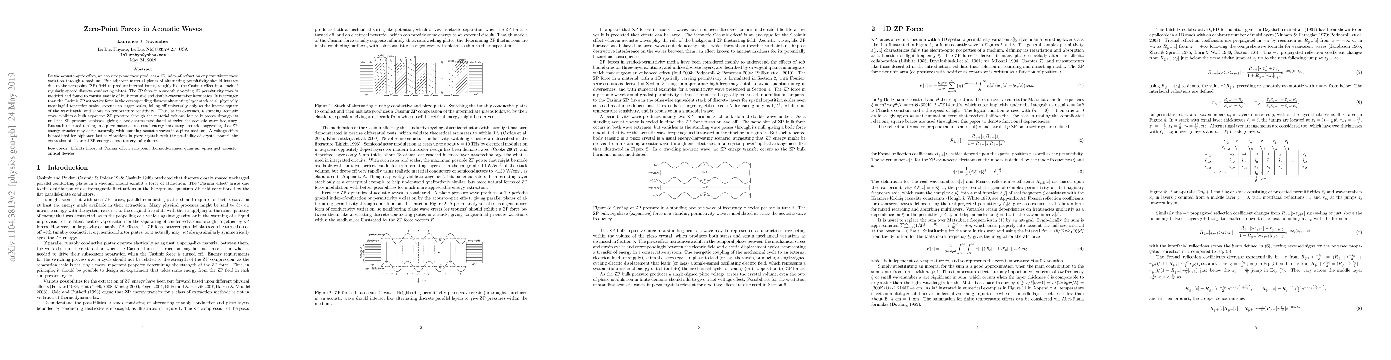 By the acousto-optic effect, an acoustic plane wave produces a 1D index-of-refraction or permittivity wave variation through a medium. But adjacent material planes of alternating permittivity should interact due to the zero-point (ZP) field to produce internal forces, roughly like the Casimir effect in a stack of regularly spaced discrete conducting plates. The ZP force in a smoothly varying 1D permittivity wave is modeled and found to consist mainly of bulk repulsive and double-wavenumber harmonics. It is stronger than the Casimir ZP attractive force in the corresponding discrete alternating-layer stack at all physically meaningful repetition scales, extends to larger scales, falling off universally only as the inverse square of the wavelength, and shows no temperature sensitivity. Thus, at its extremes, a standing acoustic wave exhibits a bulk expansive ZP pressure through the material volume, but as it passes through its null the ZP pressure vanishes, giving a body stress modulated at twice the acoustic wave frequency. But such repeated tensing in a piezo material is a usual energy-harvesting scenario, suggesting that ZP energy transfer may occur naturally with standing acoustic waves in a piezo medium. A voltage effect is predicted for biphonon lattice vibrations in piezo crystals with the possibility of 'crystal power', the extraction of electrical ZP energy across the crystal volume.