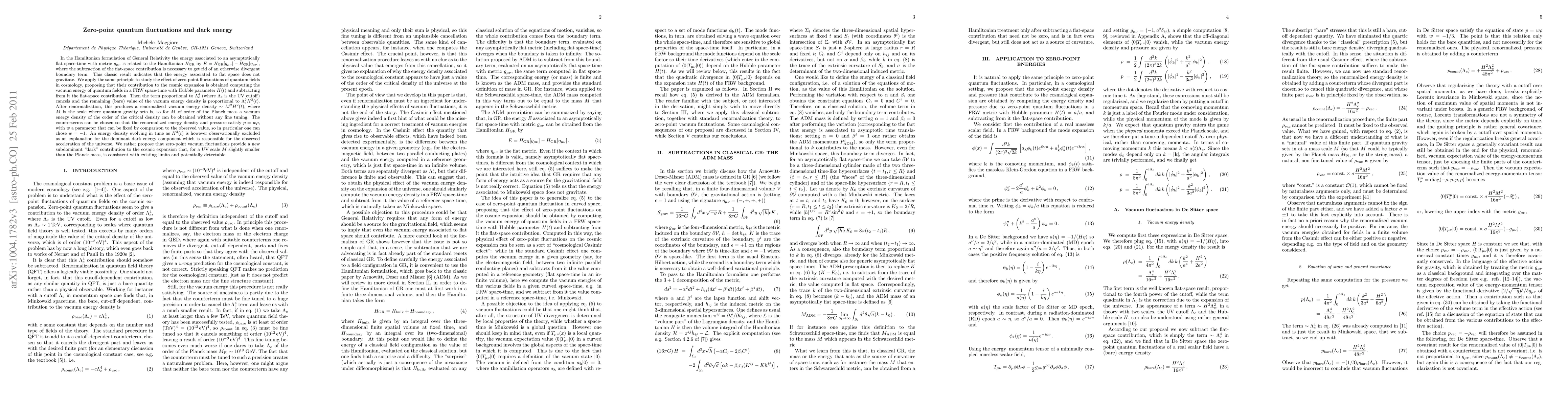 In the Hamiltonian formulation of General Relativity the energy associated to an asymptotically flat space-time with metric $g_{\mu\nu}$ is related to the Hamiltonian $H_{GR}$ by $E=H_{GR}[g_{\mu\nu}]-H_{\rm GR}[\eta_{\mu\nu}]$, where the subtraction of the flat-space contribution is necessary to get rid of an otherwise divergent boundary term. This classic result indicates that the energy associated to flat space does not gravitate. We apply the same principle to study the effect of zero-point fluctuations of quantum fields in cosmology, proposing that their contribution to the cosmic expansion is obtained computing the vacuum energy of quantum fields in a FRW space-time with Hubble parameter $H(t)$ and subtracting from it the flat-space contribution. [...] After renormalization, this produces a renormalized vacuum energy density $\sim M^2H^2(t)$, where $M$ is the scale where quantum gravity sets is, so for $M$ of order of the Planck mass a vacuum energy density of the order of the critical density can be obtained without any fine tuning. The counterterms can be chosen so that the renormalized energy density and pressure satisfy $p=w\rho$, with $w$ a parameter that can be fixed by comparison to the observed value, so in particular one can chose $w=-1$. An energy density evolving in time as $H^2(t)$ is however observationally excluded as an explanation for the dominant dark energy component which is responsible for the observed acceleration of the universe. We rather propose that zero-point vacuum fluctuations provide a new subdominant "dark" contribution to the cosmic expansion that, for a UV scale $M$ slightly smaller than the Planck mass, is consistent with existing limits and potentially detectable.
