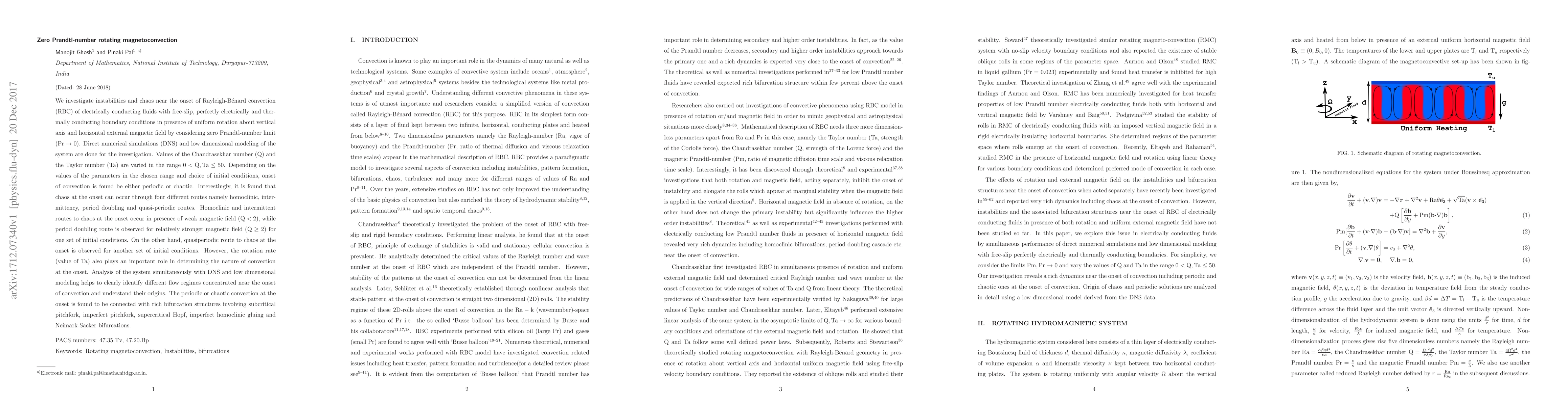 This paper explores instabilities and chaos in Rayleigh-Bénard convection of electrically conducting fluids under zero Prandtl-number conditions, with uniform rotation and a horizontal magnetic field. The study reveals that convection onset can be either periodic or chaotic, with chaos occurring via four routes: homoclinic, intermittency, period doubling, and quasi-periodic, depending on magnetic field strength and initial conditions.