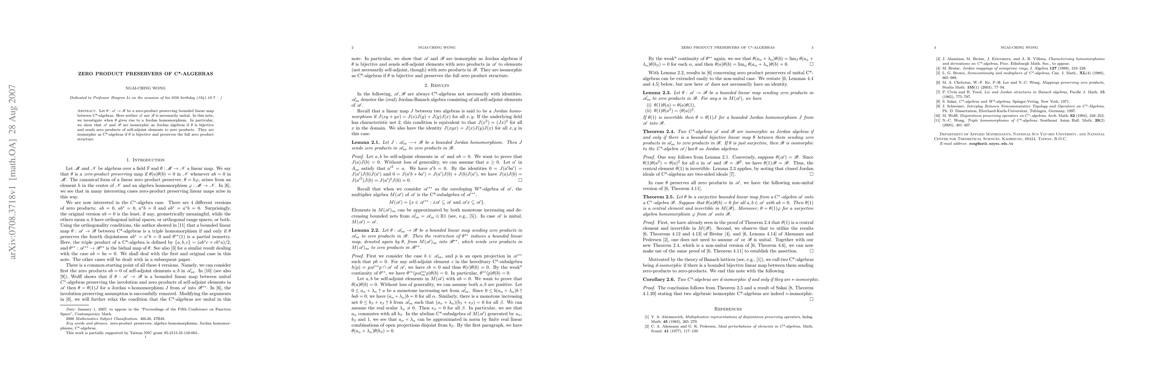 This paper explores zero-product preserving maps between C*-algebras, demonstrating that bijective maps sending zero products of self-adjoint elements to zero products result in isomorphic Jordan algebras, and those preserving the full zero product structure yield isomorphic C*-algebras.