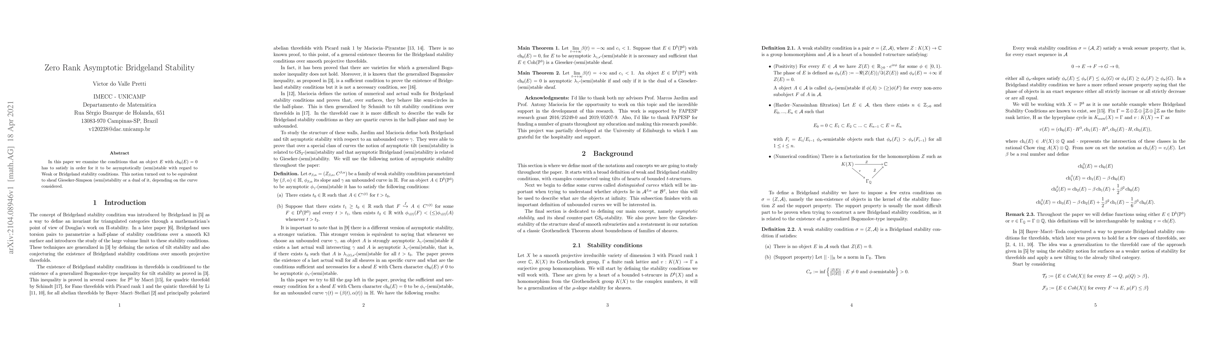 Researchers studied the conditions for objects with zero Chern class to be asymptotically stable under Weak or Bridgeland stability conditions, finding they equivalent to sheaf Gieseker-Simpson stability or its dual.