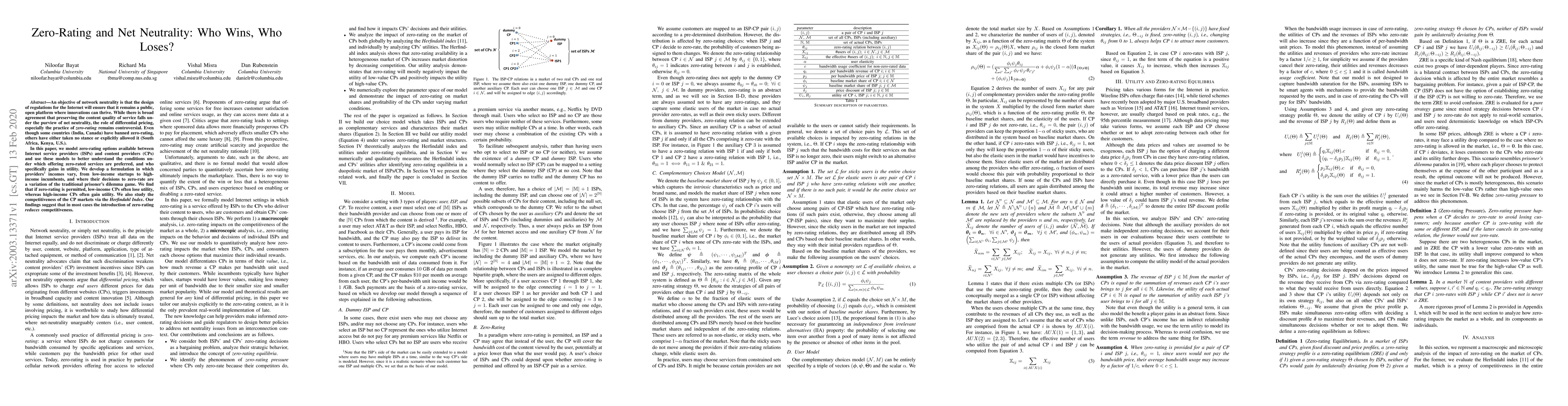 An objective of network neutrality is that the design of regulations for the Internet will ensure that it remains a public, open platform where innovations can thrive. While there is broad agreement that preserving the content quality of service falls under the purview of net neutrality, the role of differential pricing, especially the practice of \emph {zero-rating} remains controversial. Even though some countries (India, Canada) have banned zero-rating, others have either taken no stance or explicitly allowed it (South Africa, Kenya, U.S.). In this paper, we model zero-rating options available between Internet service providers (ISPs) and content providers (CPs) and use these models to better understand the conditions under which offering zero-rated services are preferred, and who specifically gains in utility. We develop a formulation in which providers' incomes vary, from low-income startups to high-income incumbents, and where their decisions to zero-rate are a variation of the traditional prisoner's dilemma game. We find that if zero-rating is permitted, low-income CPs often lose utility, whereas high-income CPs often gain utility. We also study the competitiveness of the CP markets via the \emph{Herfindahl Index}. Our findings suggest that in most cases the introduction of zero-rating \emph{reduces} competitiveness.
