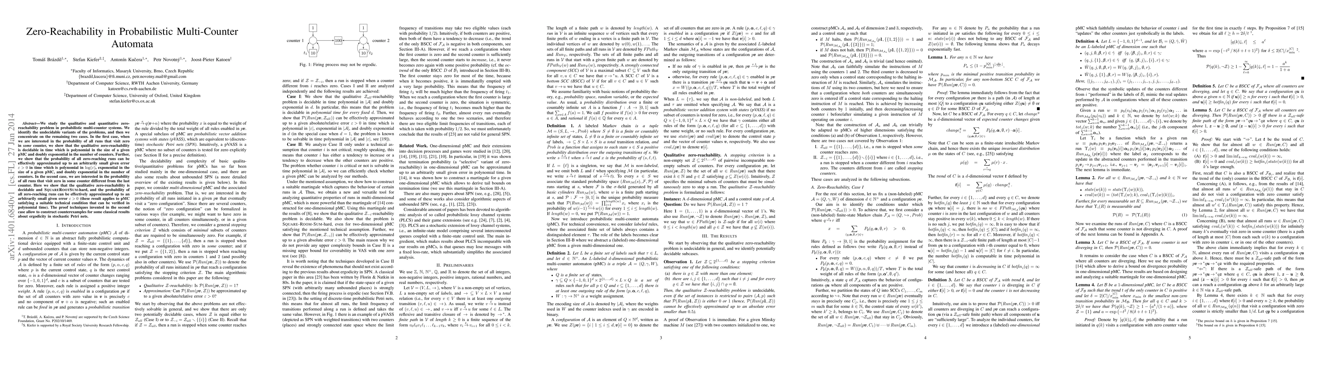 We study the qualitative and quantitative zero-reachability problem in probabilistic multi-counter systems. We identify the undecidable variants of the problems, and then we concentrate on the remaining two cases. In the first case, when we are interested in the probability of all runs that visit zero in some counter, we show that the qualitative zero-reachability is decidable in time which is polynomial in the size of a given pMC and doubly exponential in the number of counters. Further, we show that the probability of all zero-reaching runs can be effectively approximated up to an arbitrarily small given error epsilon > 0 in time which is polynomial in log(epsilon), exponential in the size of a given pMC, and doubly exponential in the number of counters. In the second case, we are interested in the probability of all runs that visit zero in some counter different from the last counter. Here we show that the qualitative zero-reachability is decidable and SquareRootSum-hard, and the probability of all zero-reaching runs can be effectively approximated up to an arbitrarily small given error epsilon > 0 (these result applies to pMC satisfying a suitable technical condition that can be verified in polynomial time). The proof techniques invented in the second case allow to construct counterexamples for some classical results about ergodicity in stochastic Petri nets.
