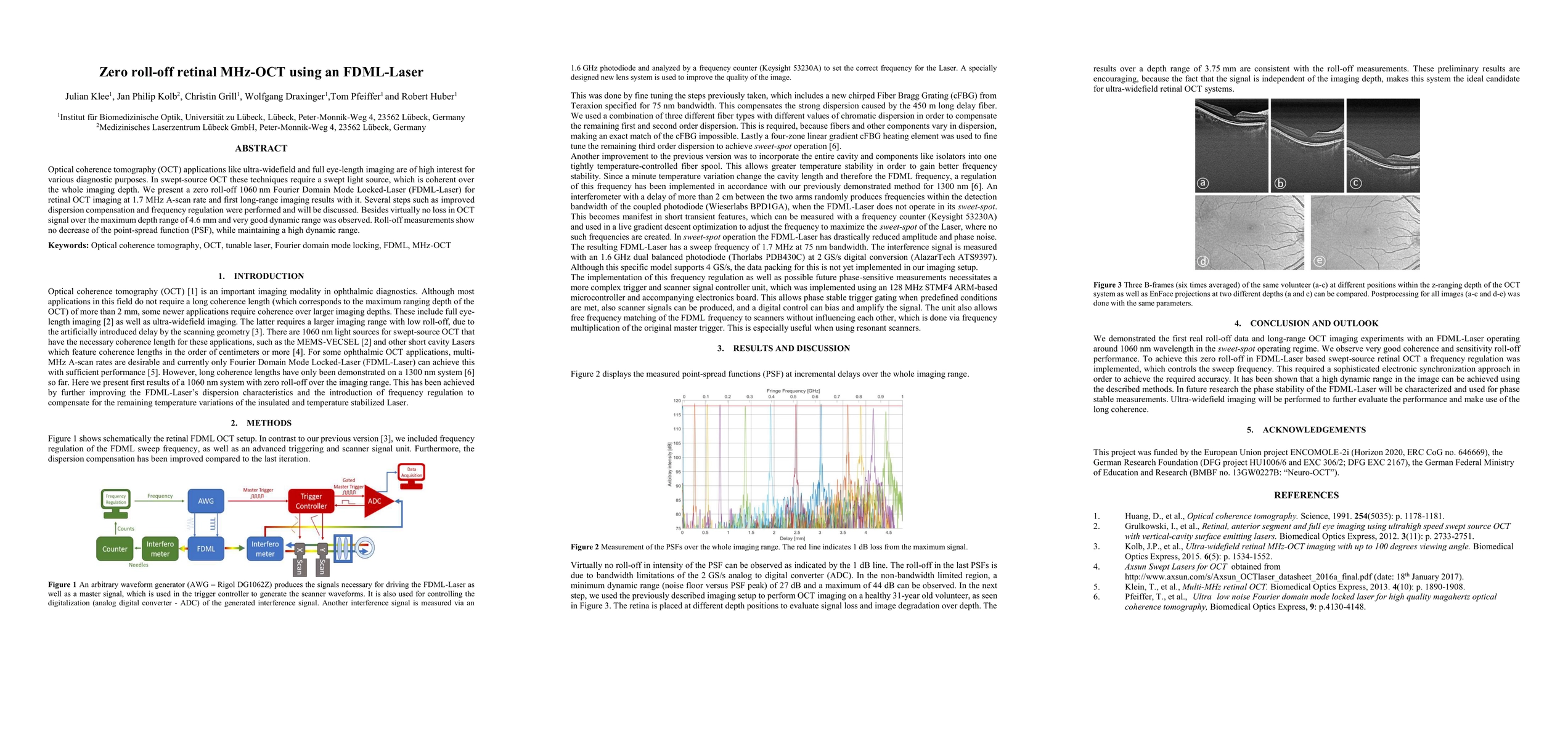 This paper presents a zero roll-off 1060 nm FDML-Laser for high-speed retinal OCT imaging at 1.7 MHz, achieving virtually no loss in OCT signal over a 4.6 mm depth range and maintaining a high dynamic range without roll-off in the point-spread function.