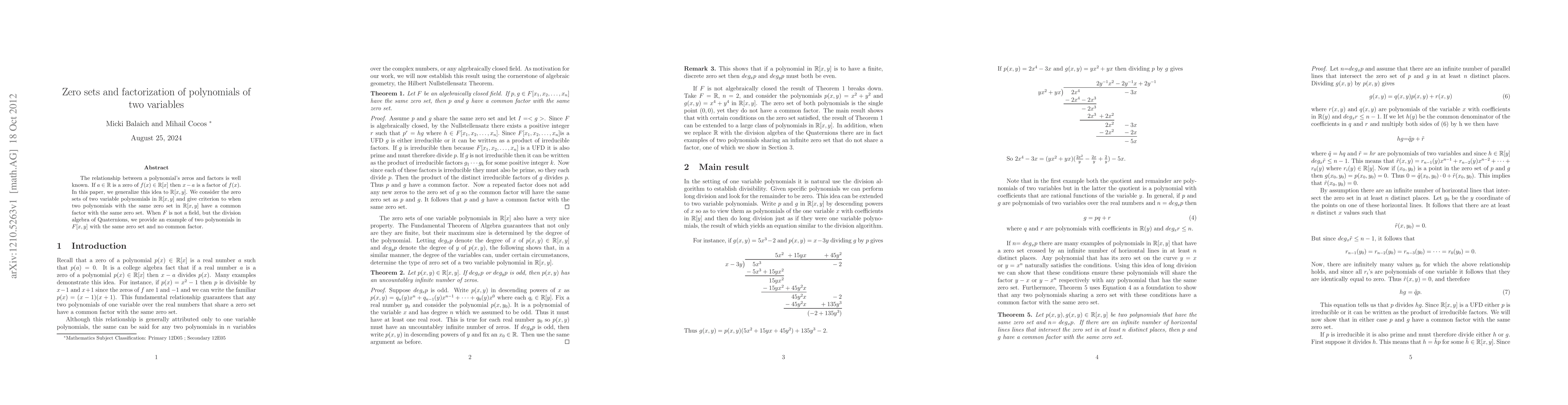 This paper explores the generalization of polynomial zeros and factorization to two-variable polynomials with real coefficients, establishing criteria for when such polynomials sharing a zero set have common factors. It also presents an example of polynomials over quaternions with identical zero sets but no common factor.