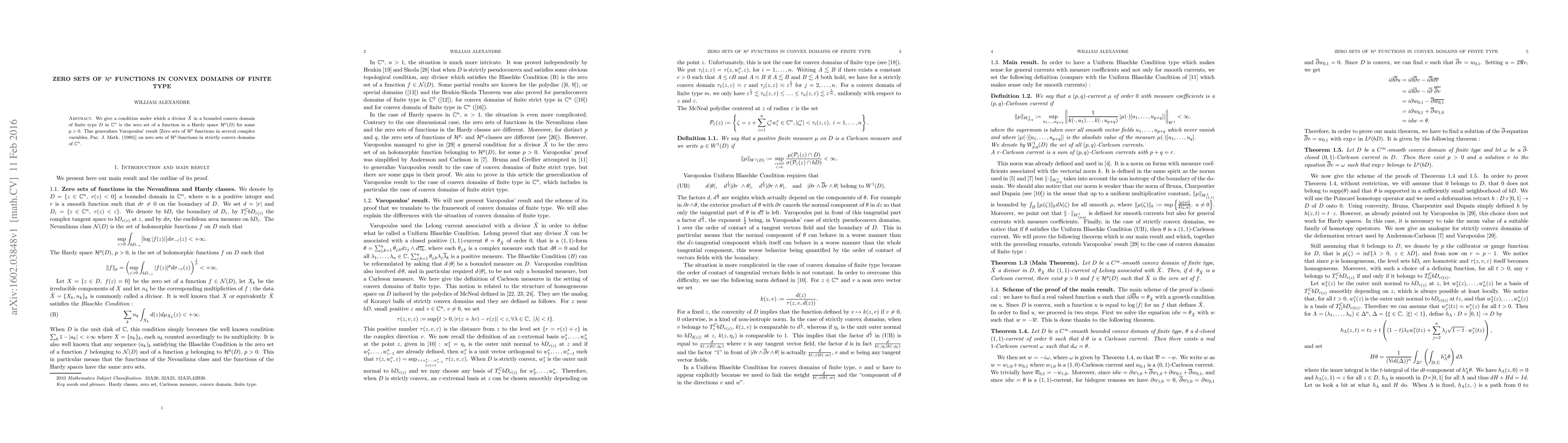 This paper provides a condition for a divisor X in a bounded convex domain of finite type D in C^n to be the zero set of a function in Hardy space H^p(D) for some p > 0, generalizing Varopoulos' earlier result for strictly convex domains.
