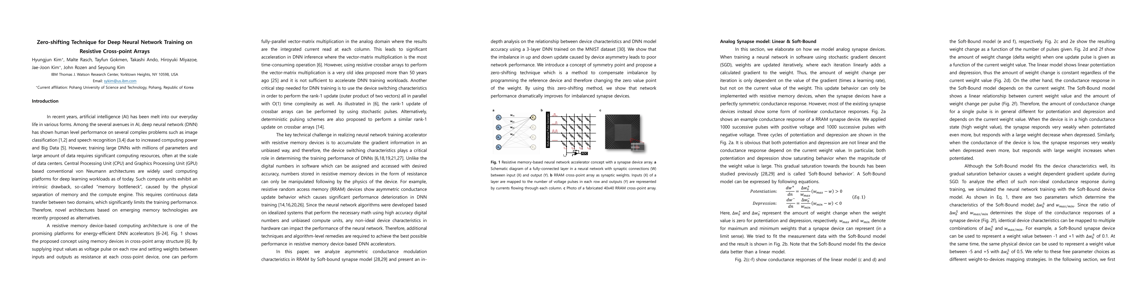 This paper proposes a zero-shifting technique to address the imbalance in conductance modulation in resistive memory devices, which significantly hinders the performance of deep neural network training. The method compensates for this imbalance by adjusting the zero value point of the weight, thereby dramatically improving network performance on the MNIST dataset.