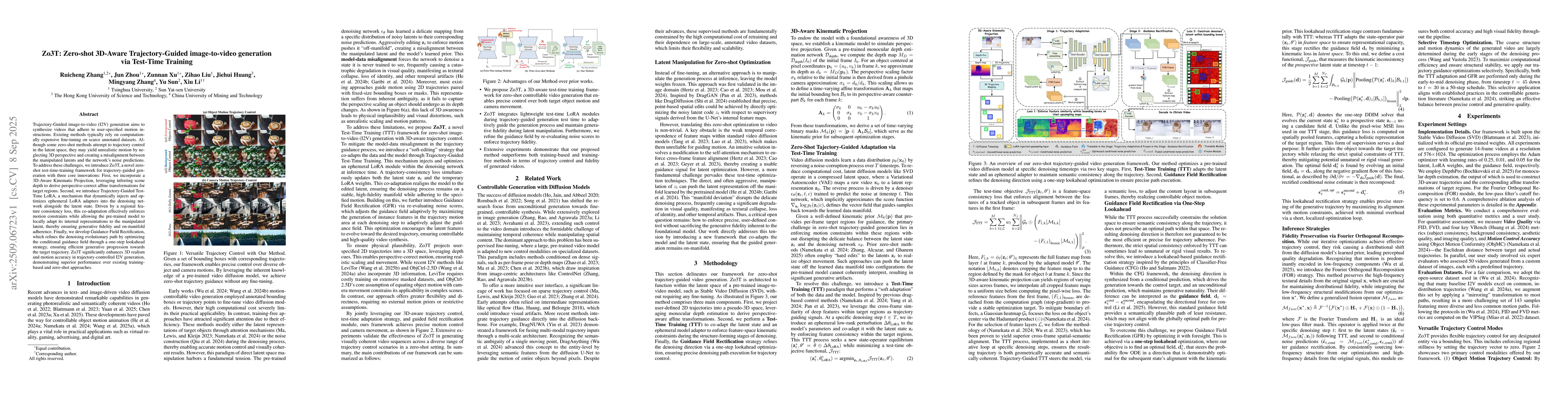 Trajectory-Guided image-to-video (I2V) generation aims to synthesize videos that adhere to user-specified motion instructions. Existing methods typically rely on computationally expensive fine-tuning on scarce annotated datasets. Although some zero-shot methods attempt to trajectory control in the latent space, they may yield unrealistic motion by neglecting 3D perspective and creating a misalignment between the manipulated latents and the network's noise predictions. To address these challenges, we introduce Zo3T, a novel zero-shot test-time-training framework for trajectory-guided generation with three core innovations: First, we incorporate a 3D-Aware Kinematic Projection, leveraging inferring scene depth to derive perspective-correct affine transformations for target regions. Second, we introduce Trajectory-Guided Test-Time LoRA, a mechanism that dynamically injects and optimizes ephemeral LoRA adapters into the denoising network alongside the latent state. Driven by a regional feature consistency loss, this co-adaptation effectively enforces motion constraints while allowing the pre-trained model to locally adapt its internal representations to the manipulated latent, thereby ensuring generative fidelity and on-manifold adherence. Finally, we develop Guidance Field Rectification, which refines the denoising evolutionary path by optimizing the conditional guidance field through a one-step lookahead strategy, ensuring efficient generative progression towards the target trajectory. Zo3T significantly enhances 3D realism and motion accuracy in trajectory-controlled I2V generation, demonstrating superior performance over existing training-based and zero-shot approaches.