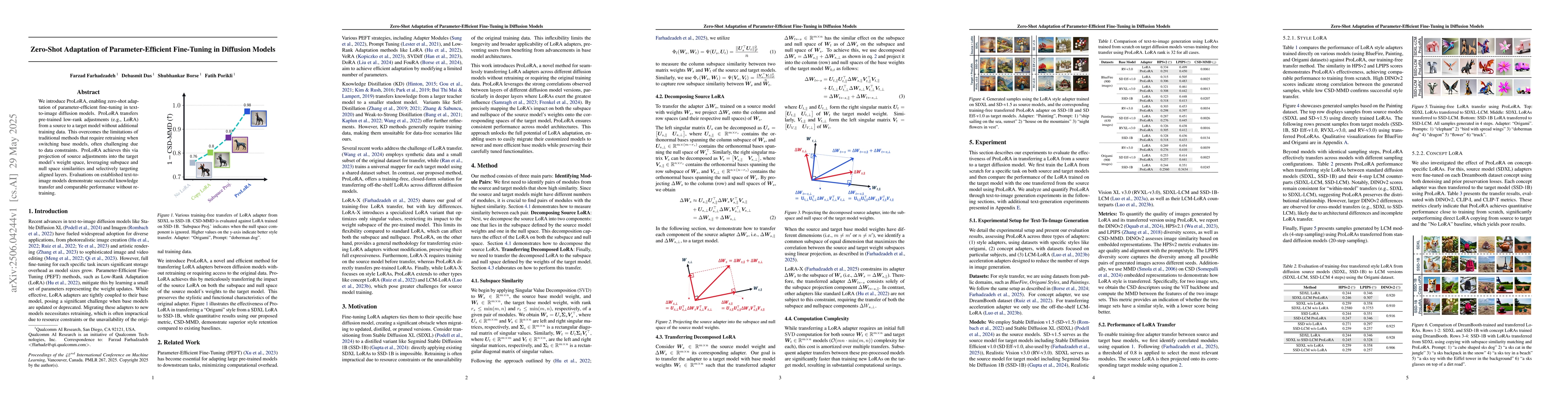 Researchers introduced ProLoRA, a method that enables zero-shot adaptation of parameter-efficient fine-tuning in text-to-image diffusion models without requiring additional training data. This allows for efficient knowledge transfer and comparable performance to retrained models.