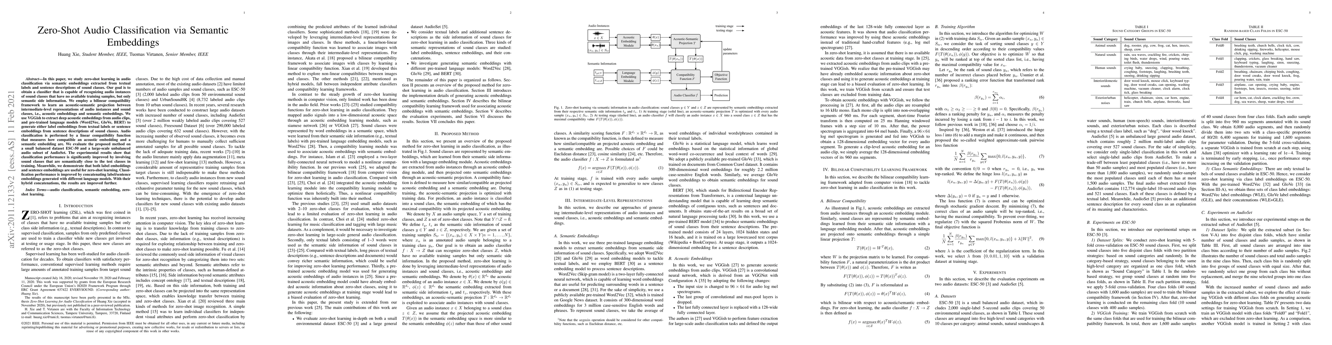 This paper proposes a zero-shot audio classification method using semantic embeddings from textual labels and descriptions to recognize sound classes without training samples. It employs a bilinear compatibility framework to project acoustic embeddings from VGGish and semantic embeddings from language models, achieving improved classification performance on ESC-50 and AudioSet.