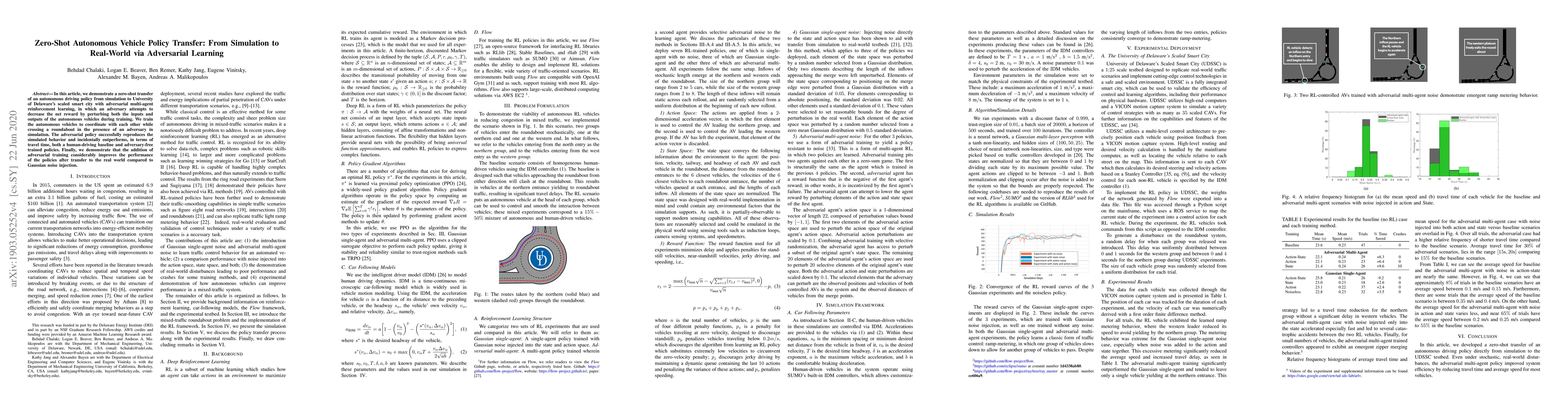 This paper presents a zero-shot transfer of autonomous vehicle policies from simulation to real-world environments using adversarial multi-agent reinforcement learning, showing improved performance and robustness in the real-world setting. The adversarial training enhances the policy's stability and outperforms both human-driving and non-adversarial baselines.