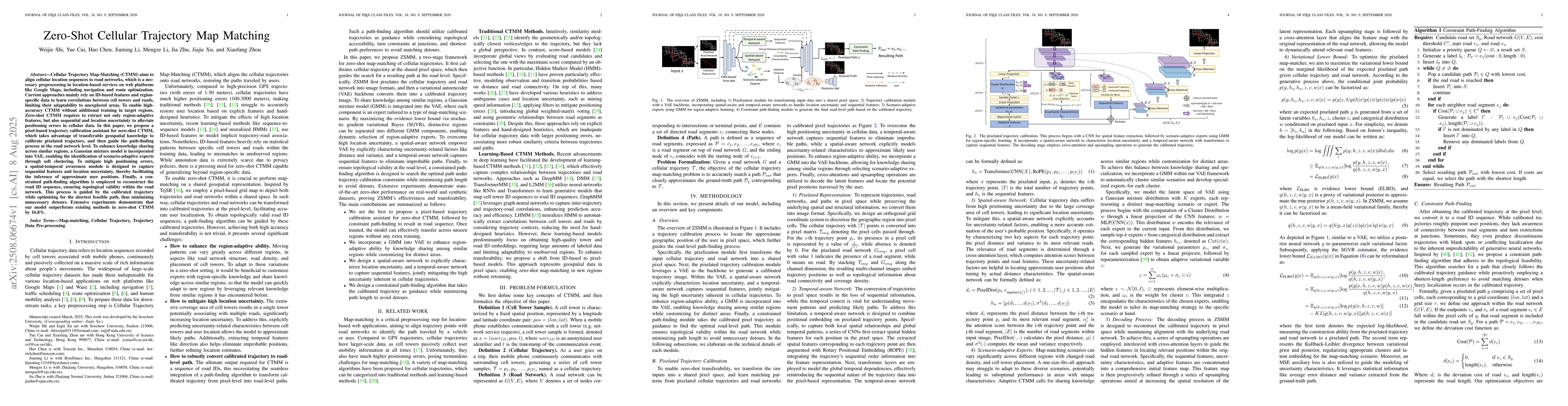 Cellular Trajectory Map-Matching (CTMM) aims to align cellular location sequences to road networks, which is a necessary preprocessing in location-based services on web platforms like Google Maps, including navigation and route optimization. Current approaches mainly rely on ID-based features and region-specific data to learn correlations between cell towers and roads, limiting their adaptability to unexplored areas. To enable high-accuracy CTMM without additional training in target regions, Zero-shot CTMM requires to extract not only region-adaptive features, but also sequential and location uncertainty to alleviate positioning errors in cellular data. In this paper, we propose a pixel-based trajectory calibration assistant for zero-shot CTMM, which takes advantage of transferable geospatial knowledge to calibrate pixelated trajectory, and then guide the path-finding process at the road network level. To enhance knowledge sharing across similar regions, a Gaussian mixture model is incorporated into VAE, enabling the identification of scenario-adaptive experts through soft clustering. To mitigate high positioning errors, a spatial-temporal awareness module is designed to capture sequential features and location uncertainty, thereby facilitating the inference of approximate user positions. Finally, a constrained path-finding algorithm is employed to reconstruct the road ID sequence, ensuring topological validity within the road network. This process is guided by the calibrated trajectory while optimizing for the shortest feasible path, thus minimizing unnecessary detours. Extensive experiments demonstrate that our model outperforms existing methods in zero-shot CTMM by 16.8\%.