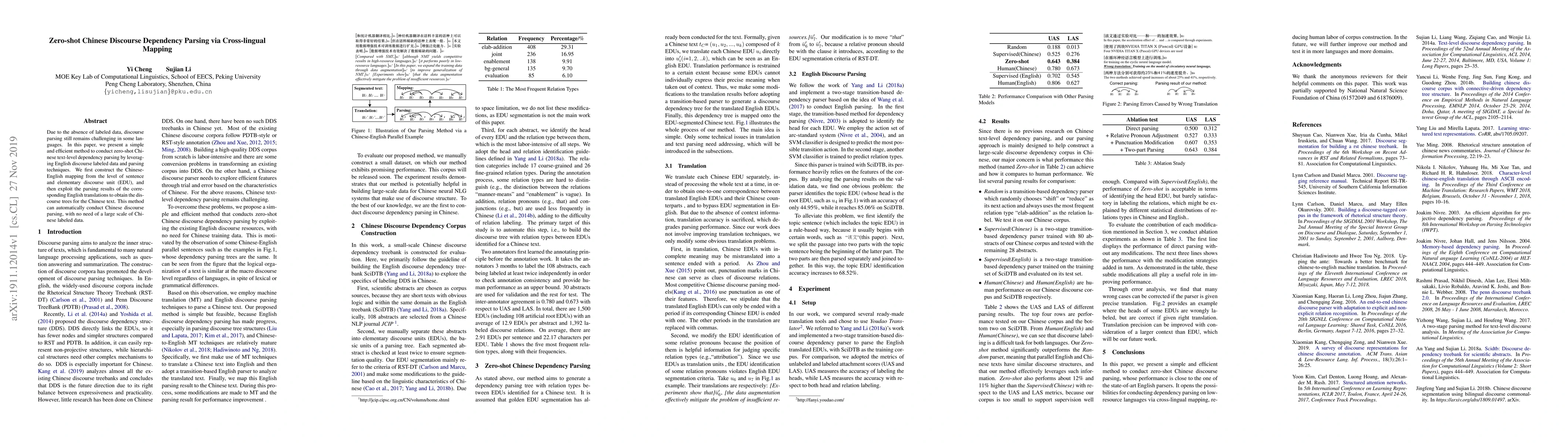 This paper proposes a zero-shot method for Chinese discourse dependency parsing using English labeled data, constructing a Chinese-English mapping at sentence and EDU levels, and leveraging English parsing to generate discourse trees for Chinese text without requiring large labeled datasets.