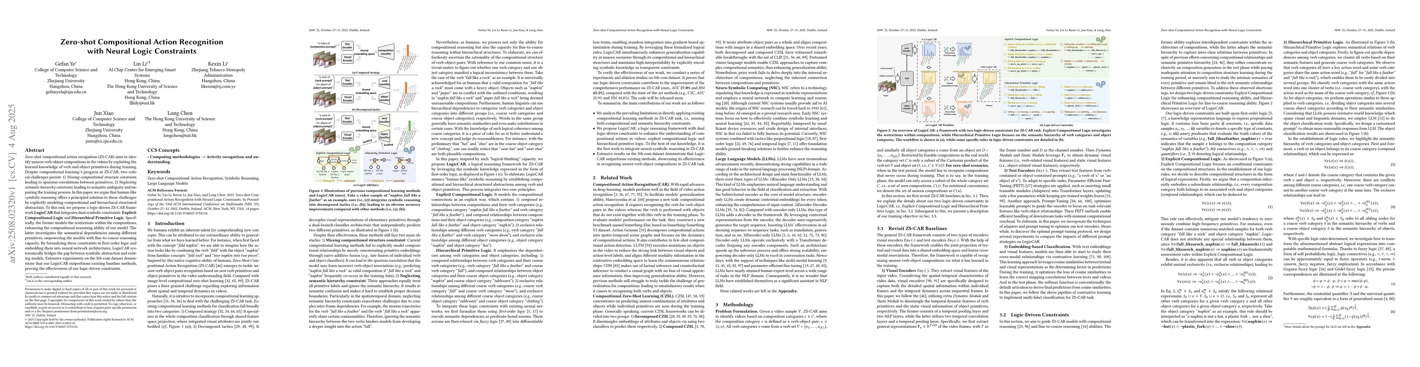 Zero-shot compositional action recognition (ZS-CAR) aims to identify unseen verb-object compositions in the videos by exploiting the learned knowledge of verb and object primitives during training. Despite compositional learning's progress in ZS-CAR, two critical challenges persist: 1) Missing compositional structure constraint, leading to spurious correlations between primitives; 2) Neglecting semantic hierarchy constraint, leading to semantic ambiguity and impairing the training process. In this paper, we argue that human-like symbolic reasoning offers a principled solution to these challenges by explicitly modeling compositional and hierarchical structured abstraction. To this end, we propose a logic-driven ZS-CAR framework LogicCAR that integrates dual symbolic constraints: Explicit Compositional Logic and Hierarchical Primitive Logic. Specifically, the former models the restrictions within the compositions, enhancing the compositional reasoning ability of our model. The latter investigates the semantical dependencies among different primitives, empowering the models with fine-to-coarse reasoning capacity. By formalizing these constraints in first-order logic and embedding them into neural network architectures, LogicCAR systematically bridges the gap between symbolic abstraction and existing models. Extensive experiments on the Sth-com dataset demonstrate that our LogicCAR outperforms existing baseline methods, proving the effectiveness of our logic-driven constraints.