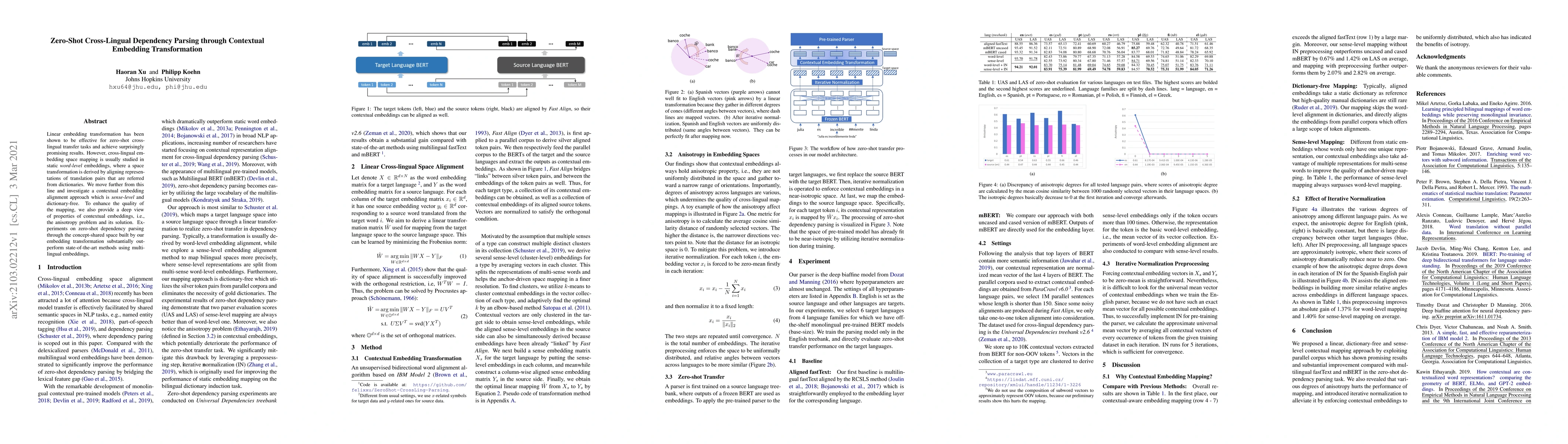 This paper proposes a contextual embedding transformation method for zero-shot cross-lingual dependency parsing, moving beyond static word-level alignments to a sense-level, dictionary-free approach. The method outperforms existing techniques by addressing anisotropy in contextual embeddings and demonstrating superior parsing performance.