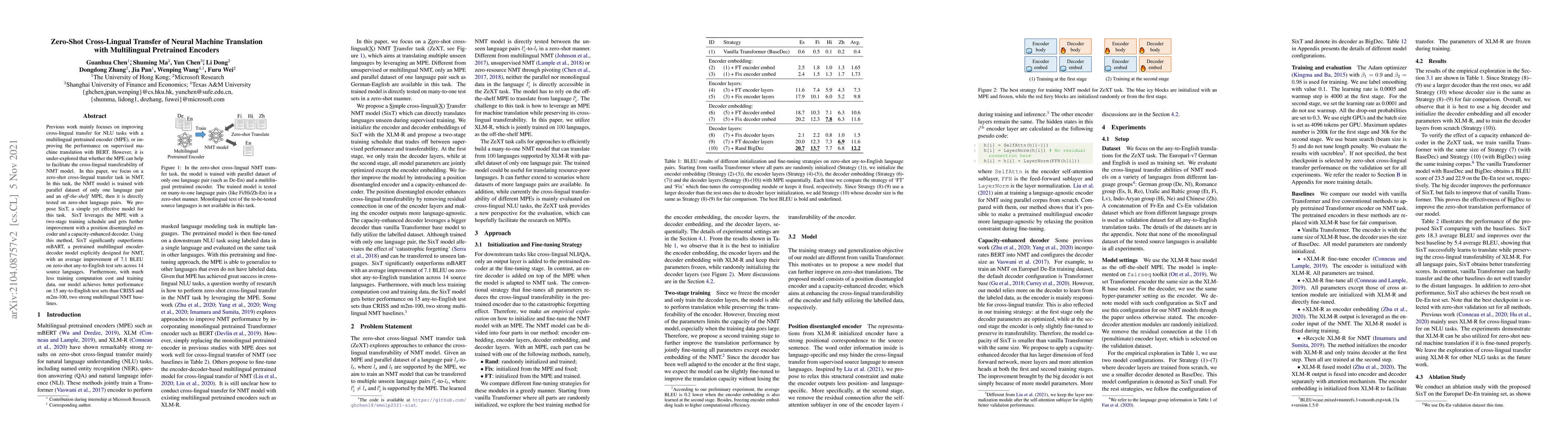This paper proposes SixT, a model leveraging a multilingual pretrained encoder for zero-shot cross-lingual transfer in neural machine translation, achieving a 7.1 BLEU improvement over mBART on zero-shot any-to-English test sets across 14 languages, with lower computational costs and training data requirements.