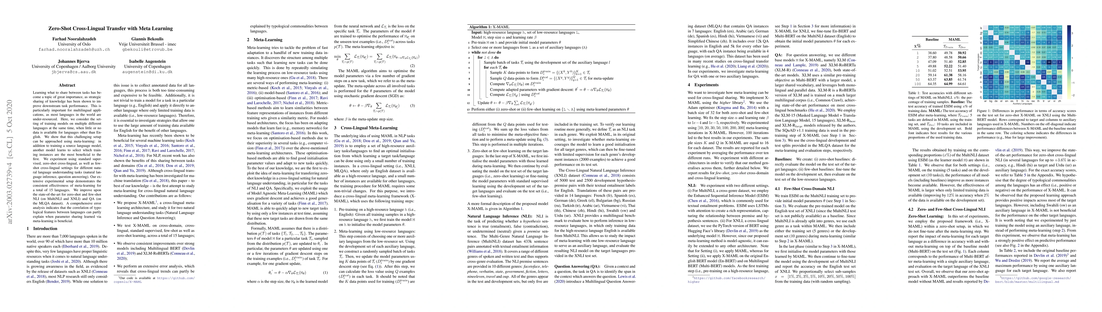 Learning what to share between tasks has been a topic of great importance recently, as strategic sharing of knowledge has been shown to improve downstream task performance. This is particularly important for multilingual applications, as most languages in the world are under-resourced. Here, we consider the setting of training models on multiple different languages at the same time, when little or no data is available for languages other than English. We show that this challenging setup can be approached using meta-learning, where, in addition to training a source language model, another model learns to select which training instances are the most beneficial to the first. We experiment using standard supervised, zero-shot cross-lingual, as well as few-shot cross-lingual settings for different natural language understanding tasks (natural language inference, question answering). Our extensive experimental setup demonstrates the consistent effectiveness of meta-learning for a total of 15 languages. We improve upon the state-of-the-art for zero-shot and few-shot NLI (on MultiNLI and XNLI) and QA (on the MLQA dataset). A comprehensive error analysis indicates that the correlation of typological features between languages can partly explain when parameter sharing learned via meta-learning is beneficial.