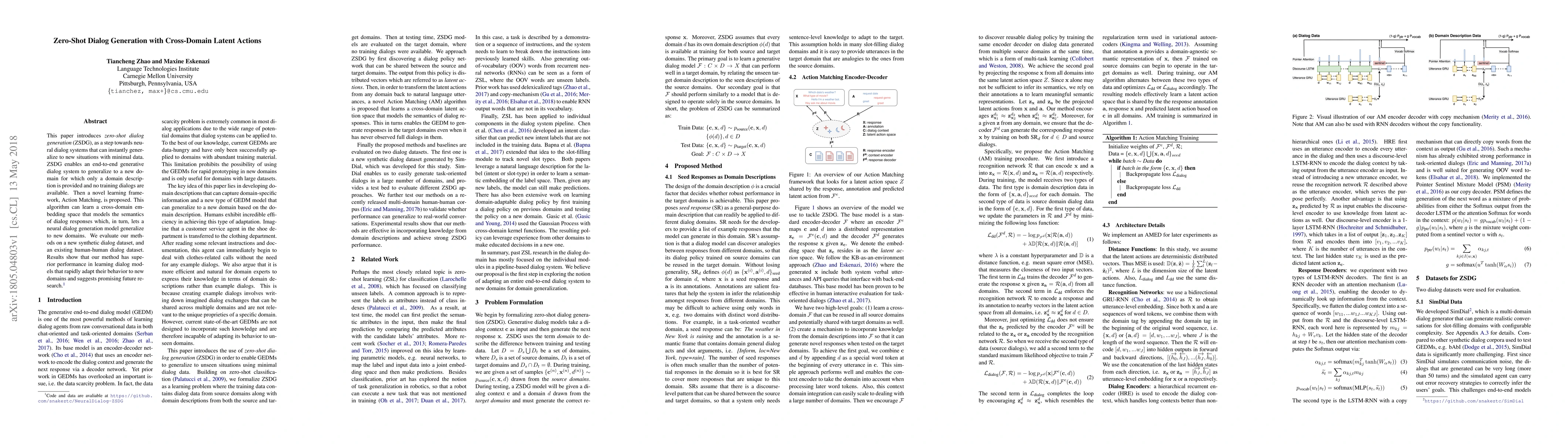This paper presents a zero-shot dialog generation method that allows neural dialog systems to generalize to new domains with no prior training data, using a novel Action Matching framework to create a cross-domain embedding space. The proposed approach demonstrates superior performance in adapting to new domains, as shown through evaluations on synthetic and human-human dialog datasets.