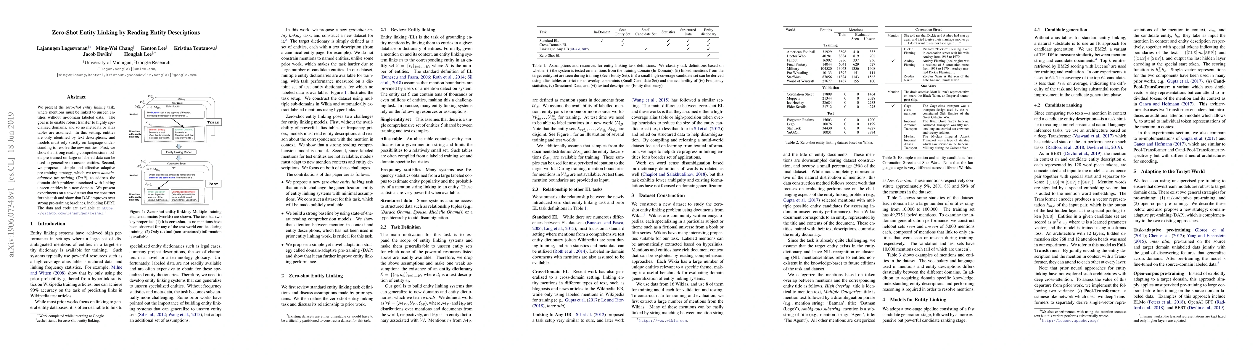 This paper introduces a zero-shot entity linking task that links mentions to unseen entities without prior labeled data, relying solely on entity descriptions. It demonstrates that pre-trained language models can generalize to new entities and proposes domain-adaptive pre-training (DAP) to tackle domain shift, achieving better results than BERT on a newly constructed dataset.