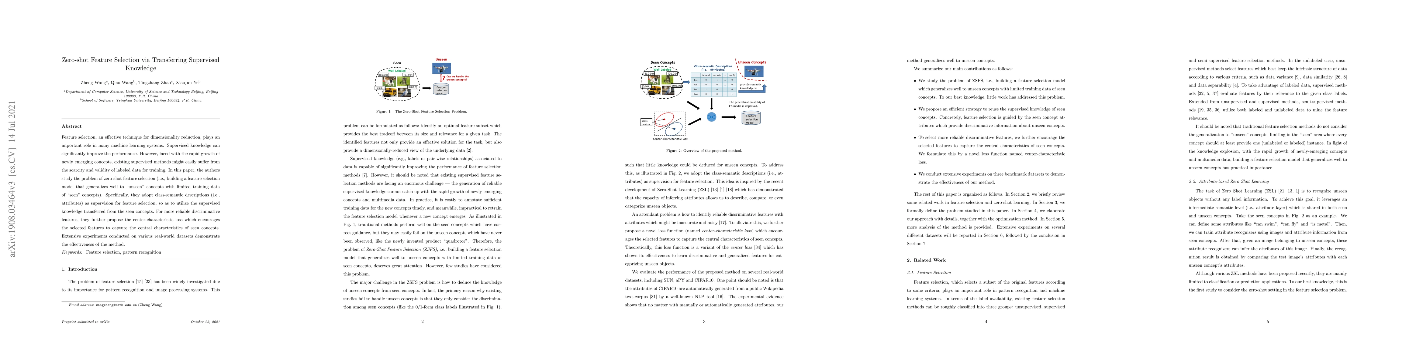 This paper proposes a zero-shot feature selection method that leverages class-semantic descriptions to generalize to unseen concepts using supervised knowledge from seen concepts. It introduces a center-characteristic loss to enhance discriminative features, and experiments show its effectiveness across various datasets.