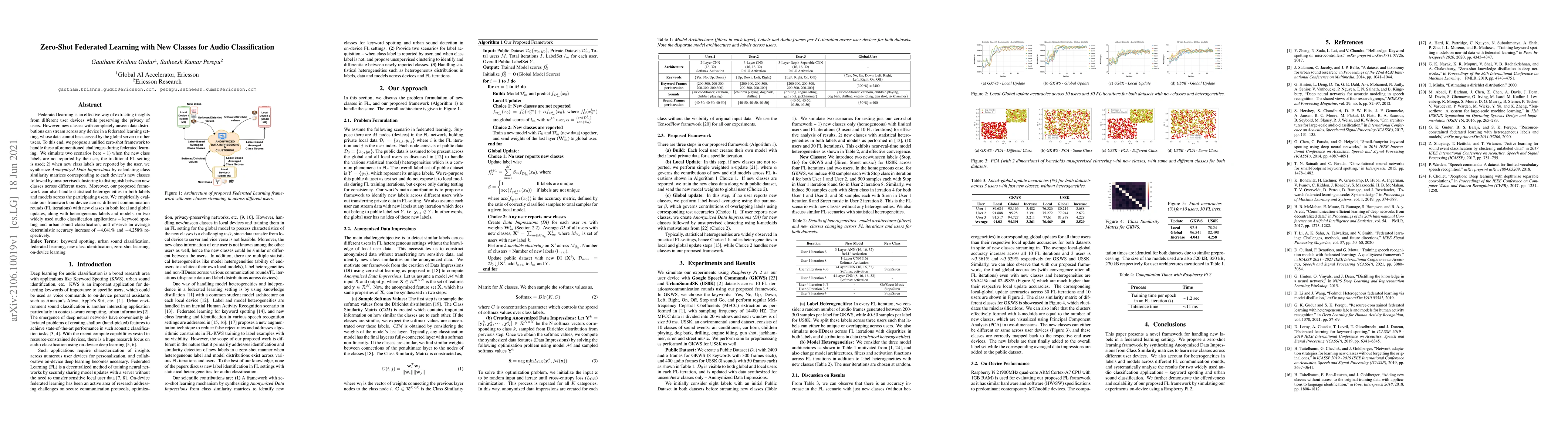 Federated learning is an effective way of extracting insights from different user devices while preserving the privacy of users. However, new classes with completely unseen data distributions can stream across any device in a federated learning setting, whose data cannot be accessed by the global server or other users. To this end, we propose a unified zero-shot framework to handle these aforementioned challenges during federated learning. We simulate two scenarios here -- 1) when the new class labels are not reported by the user, the traditional FL setting is used; 2) when new class labels are reported by the user, we synthesize Anonymized Data Impressions by calculating class similarity matrices corresponding to each device's new classes followed by unsupervised clustering to distinguish between new classes across different users. Moreover, our proposed framework can also handle statistical heterogeneities in both labels and models across the participating users. We empirically evaluate our framework on-device across different communication rounds (FL iterations) with new classes in both local and global updates, along with heterogeneous labels and models, on two widely used audio classification applications -- keyword spotting and urban sound classification, and observe an average deterministic accuracy increase of ~4.041% and ~4.258% respectively.