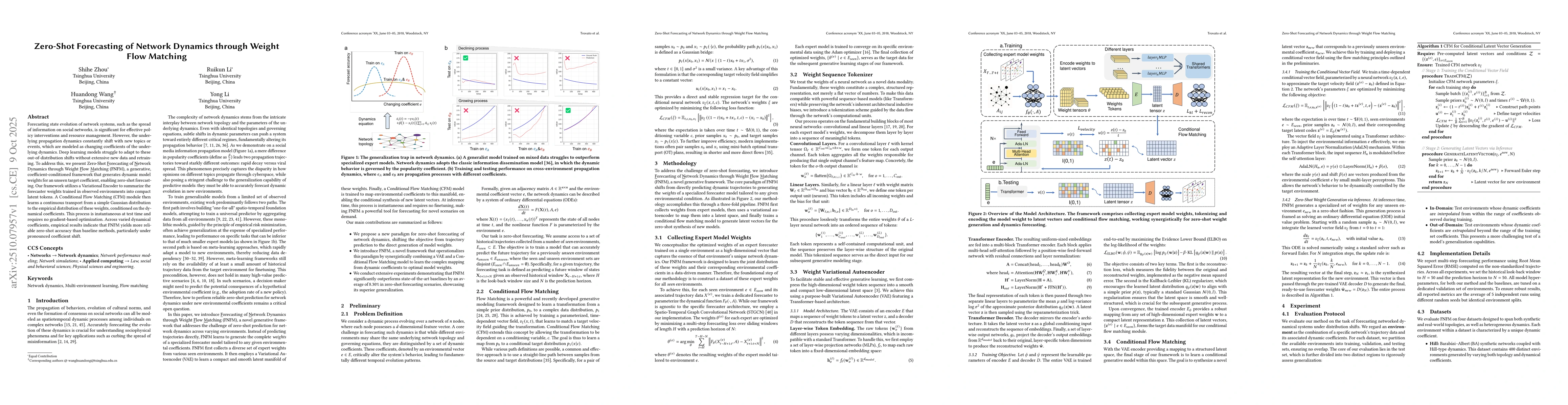 Introduces a unified approach combining weight evolution with flow matching for modeling dynamic systems, enabling zero-shot generalization across different network configurations and parameter ranges