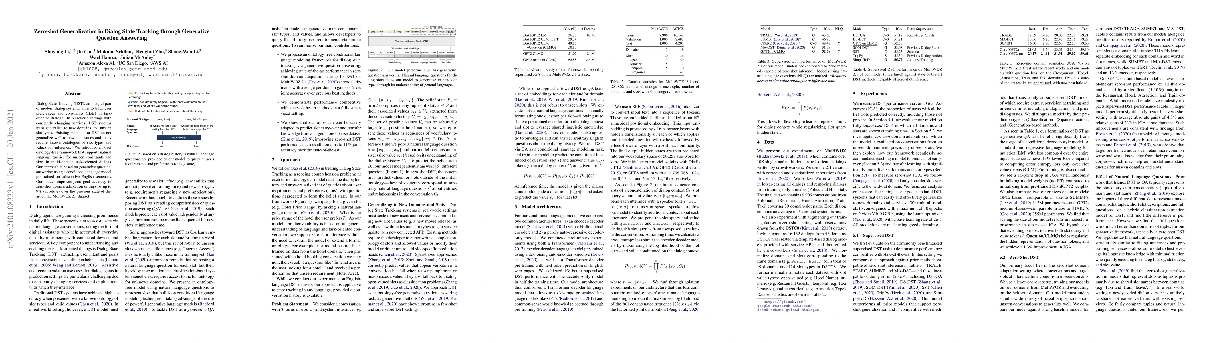 This paper introduces an ontology-free framework for Dialog State Tracking (DST) that leverages generative question-answering to handle unseen slot types in multi-domain dialogs. The proposed model achieves a 9% improvement in zero-shot domain adaptation accuracy compared to the previous state-of-the-art on the MultiWOZ 2.1 dataset.