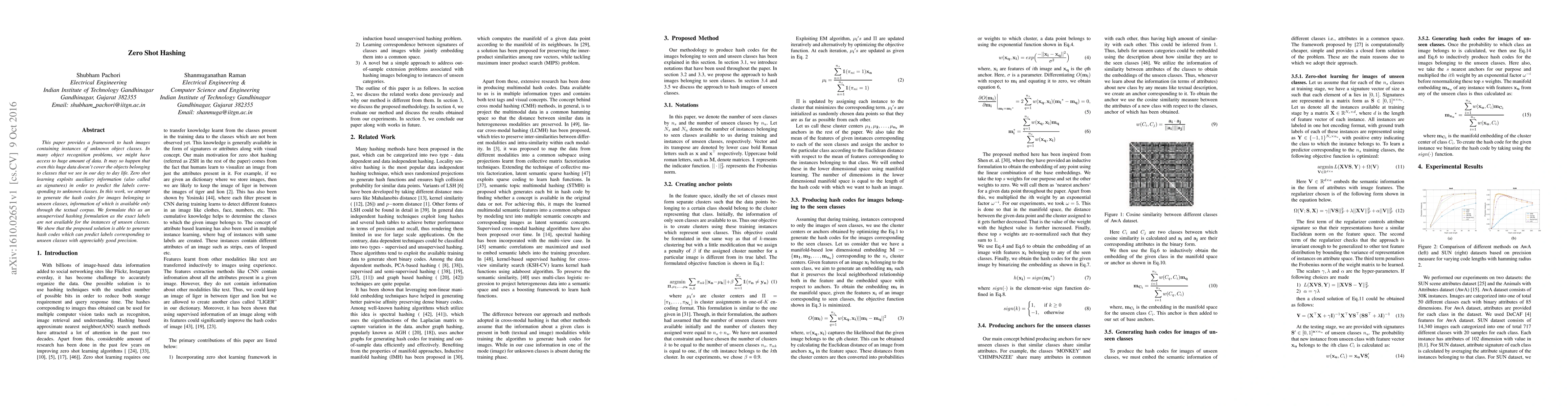 This paper provides a framework to hash images containing instances of unknown object classes. In many object recognition problems, we might have access to huge amount of data. It may so happen that even this huge data doesn't cover the objects belonging to classes that we see in our day to day life. Zero shot learning exploits auxiliary information (also called as signatures) in order to predict the labels corresponding to unknown classes. In this work, we attempt to generate the hash codes for images belonging to unseen classes, information of which is available only through the textual corpus. We formulate this as an unsupervised hashing formulation as the exact labels are not available for the instances of unseen classes. We show that the proposed solution is able to generate hash codes which can predict labels corresponding to unseen classes with appreciably good precision.
